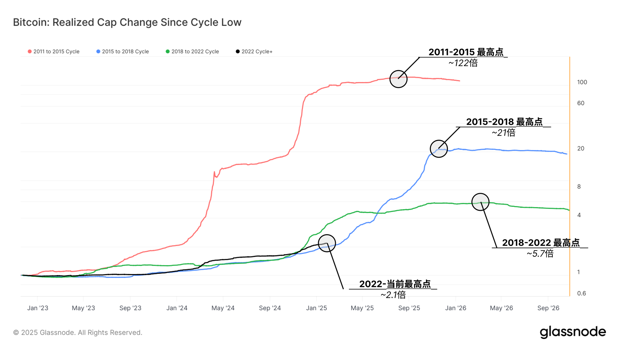 比特币的反弹反映了一个成熟的市场,整体周期增长减少,牛市回撤有所控制,已实现市值扩展适度。尽管低于先前的峰值,但当前周期2.1倍的已实现市值增长与2015–2018年周期相符,留有潜力推动长期内的狂热扩张空间。