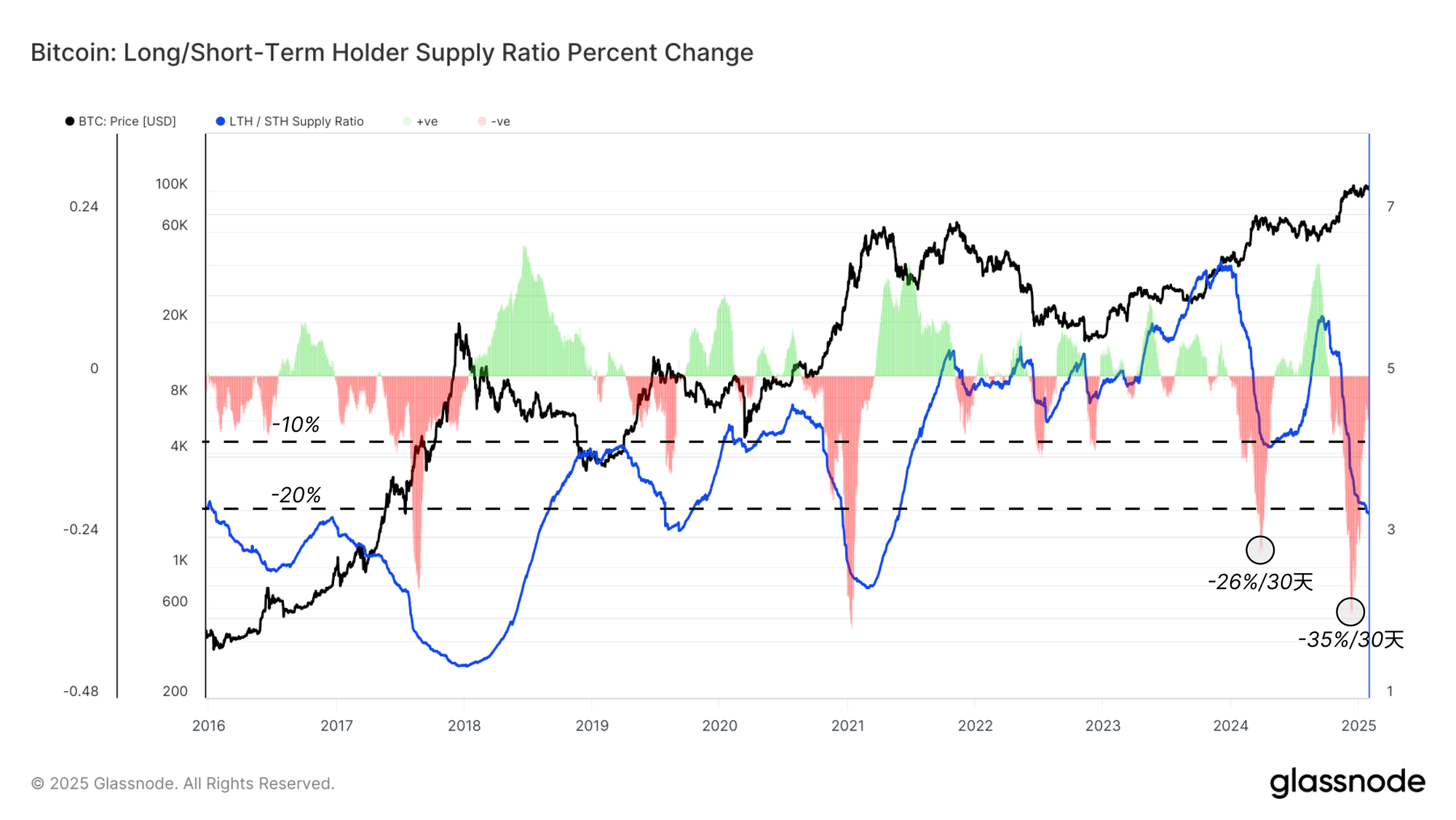 这一比例的月度变化率突出了在2023-2025年周期中发生的两波主要卖出,与2021年初和2017年底的卖出规模相当。
