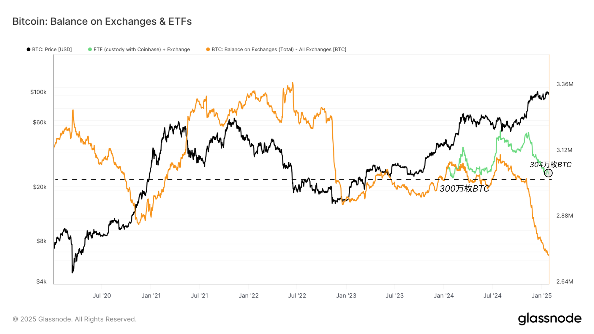 考虑到这些ETF自成立以来的净AUM增长,交易所和ETF钱包的总余额在大约300万个比特币附近波动,这与2024年1月仅由交易所持有的水平相同。