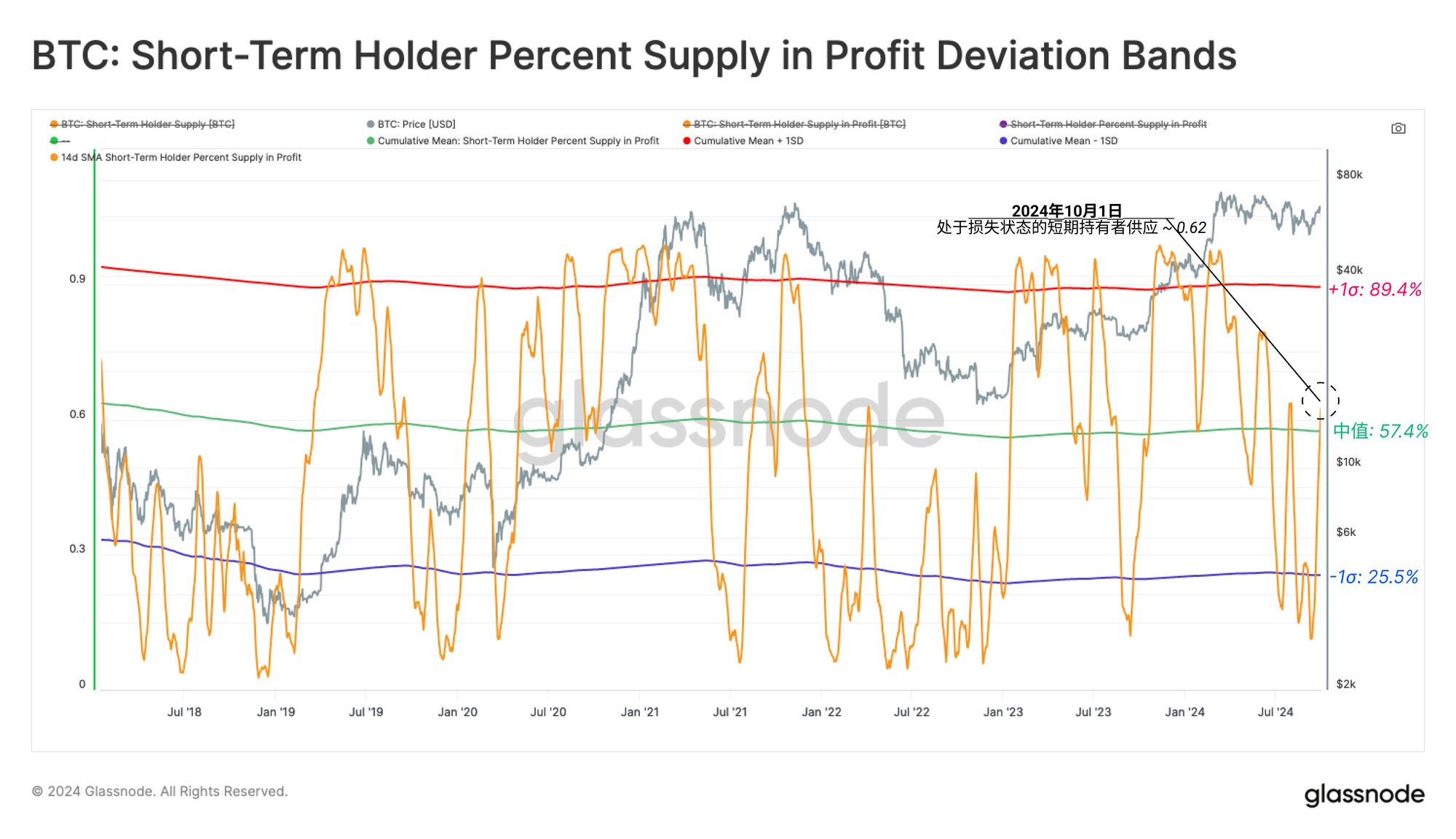 短期持有者供应的盈利比例也说明了类似的情况,超过62%的供应现在处于盈利状态。 由此可以得出两个关键见解: