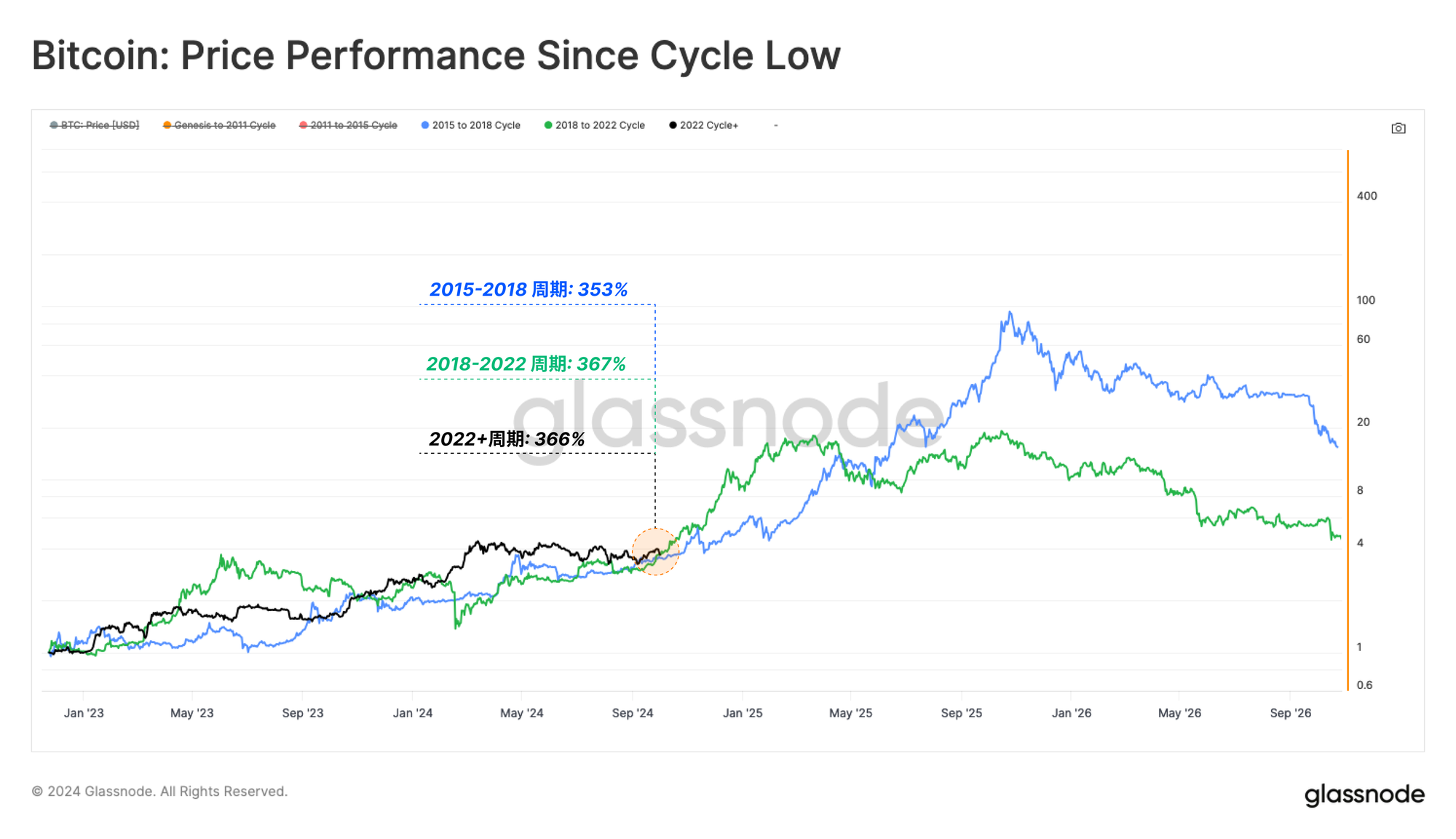 - 当我们比较比特币自熊市低点以来的周期性价格表现时,过去三个周期的价格走势表现出惊人的相似性,指数几乎处于相同位置。