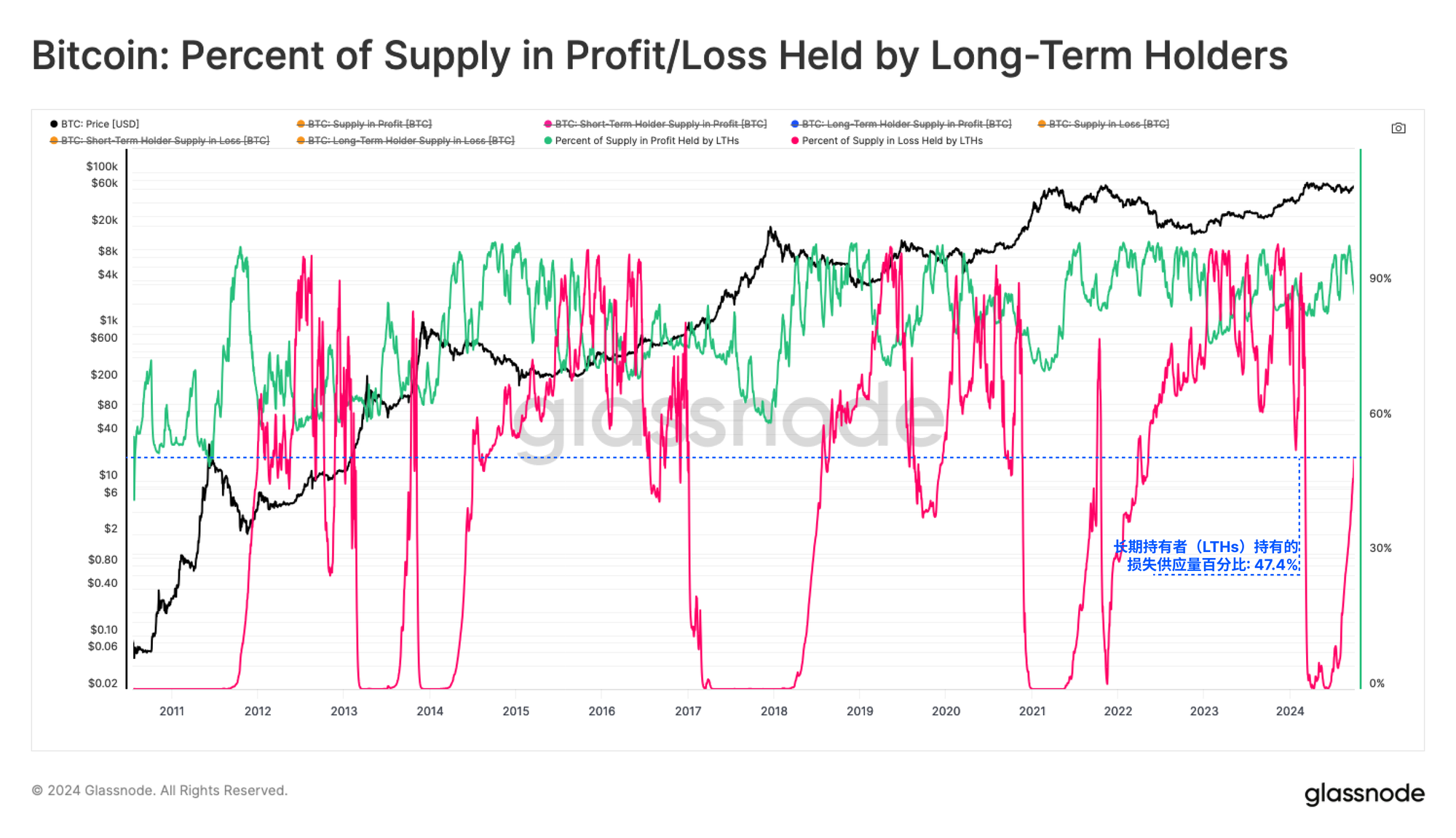 如果我们分解长期持有者持有的总供应亏损比例,我们会看到他们的主导地位上升,目前这部分持币者占所有亏损币的47.4%。