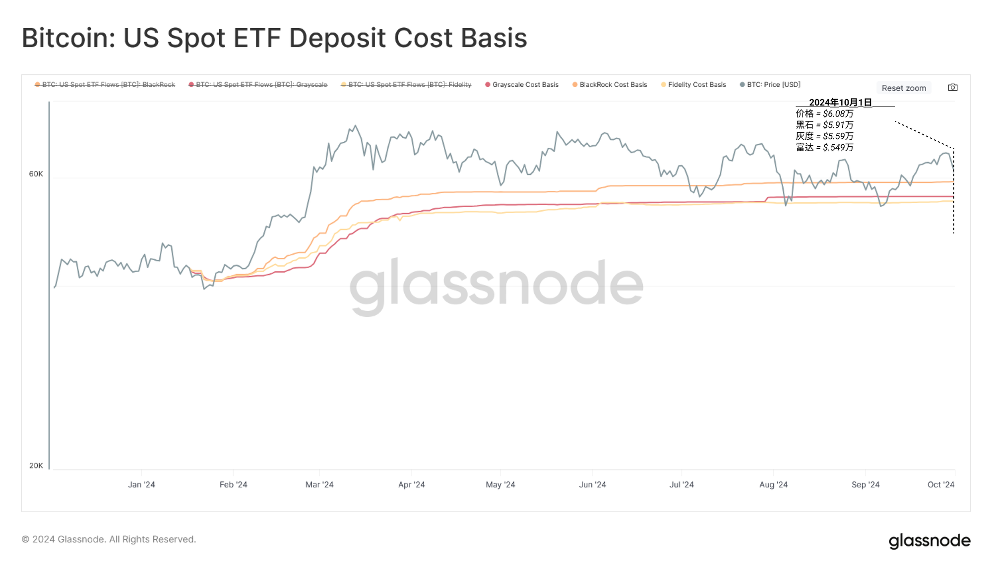 BlackRock(贝莱德)、Fidelity(富达)和Grayscale(灰度)是美国最大的现货比特币ETF,我们可以将比特币存入这些ETF的价格标记为估算其平均收购成本的参考点。这些ETF的成本基准在54900至59100美元之间。