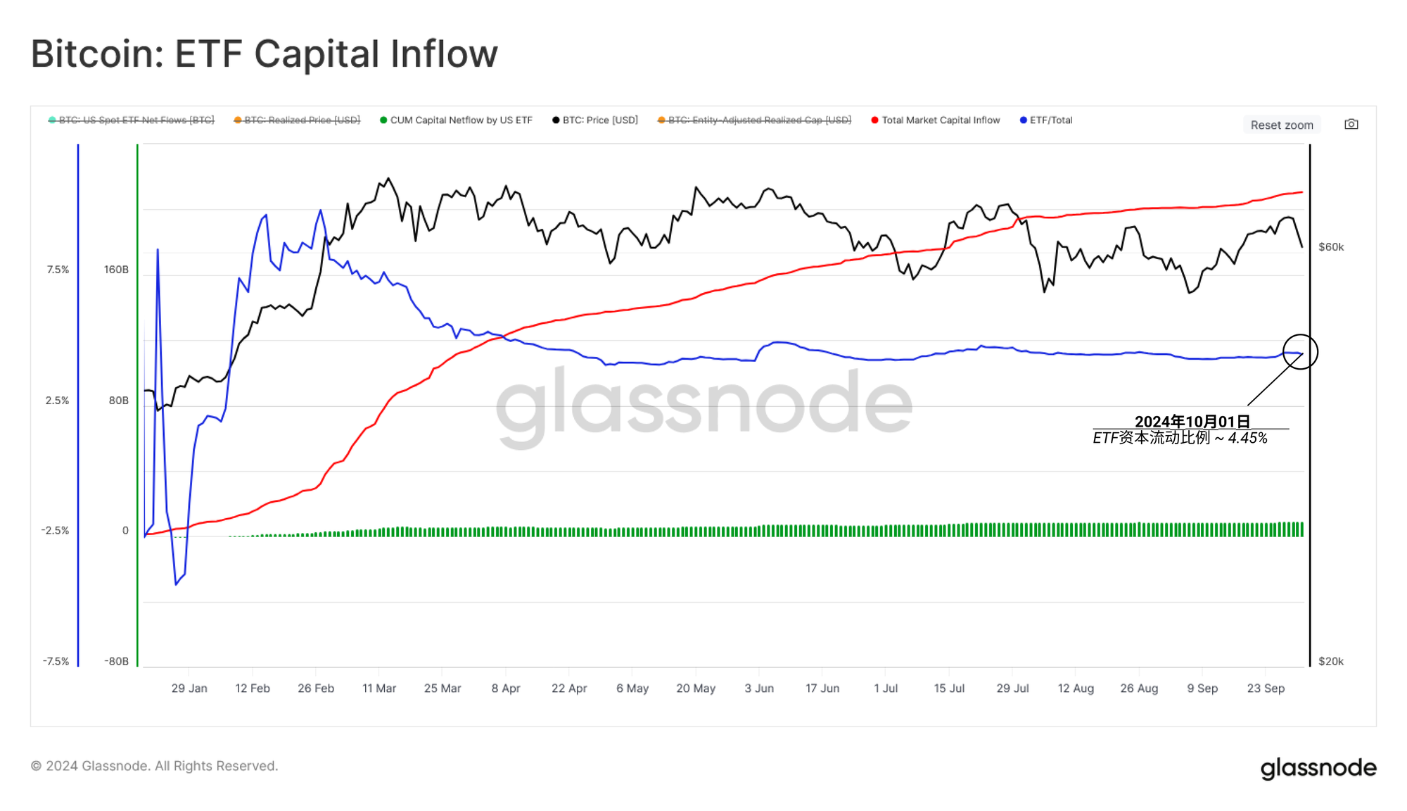 接下来,我们将投资于ETF🟩的资金与整个比特币资产的净资本🔴流入进行比较,后者通过同期内实际市值的变化来衡量。