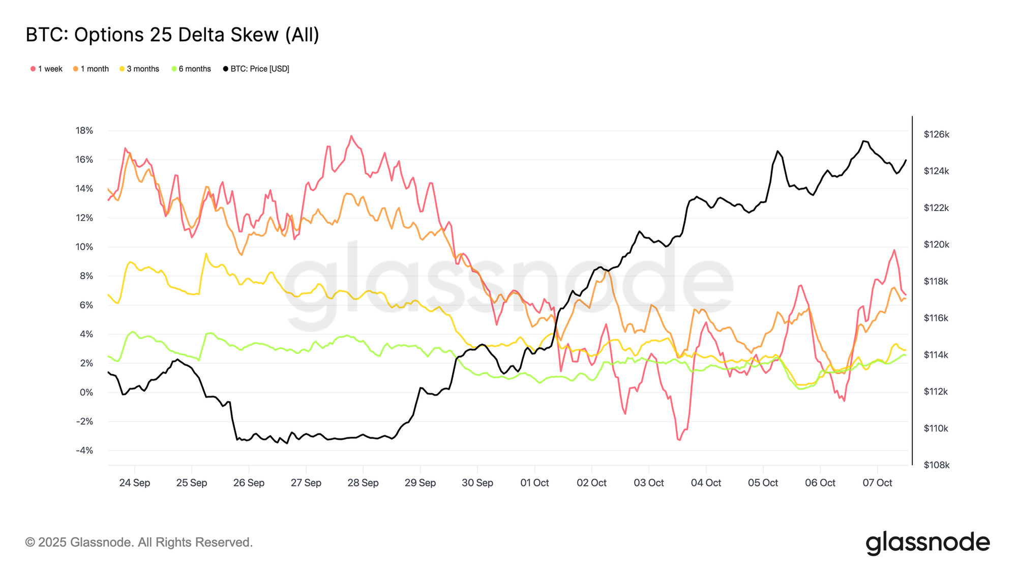 短期期限的25-Delta偏斜度从约18个波动点的看跌溢价迅速收窄至仅3个波动点,短短一周内实现了惊人的21点反转。如前所述,这类极端偏斜往往预示市场反转,而此次也不例外。交易者开始积极买入看涨期权相对看跌期权,寻求上行敞口,伴随比特币突破动能增强,标志着市场从防御性对冲转向机会性布局的明显轮换。