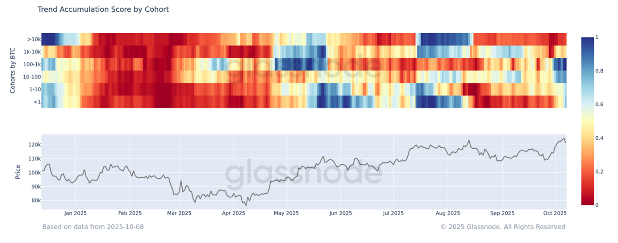 在比特币突破新高后,我们参考趋势累积分数(Trend Accumulation Score)来评估潜在需求的强度。该指标衡量不同钱包群体之间的累积与分布平衡。