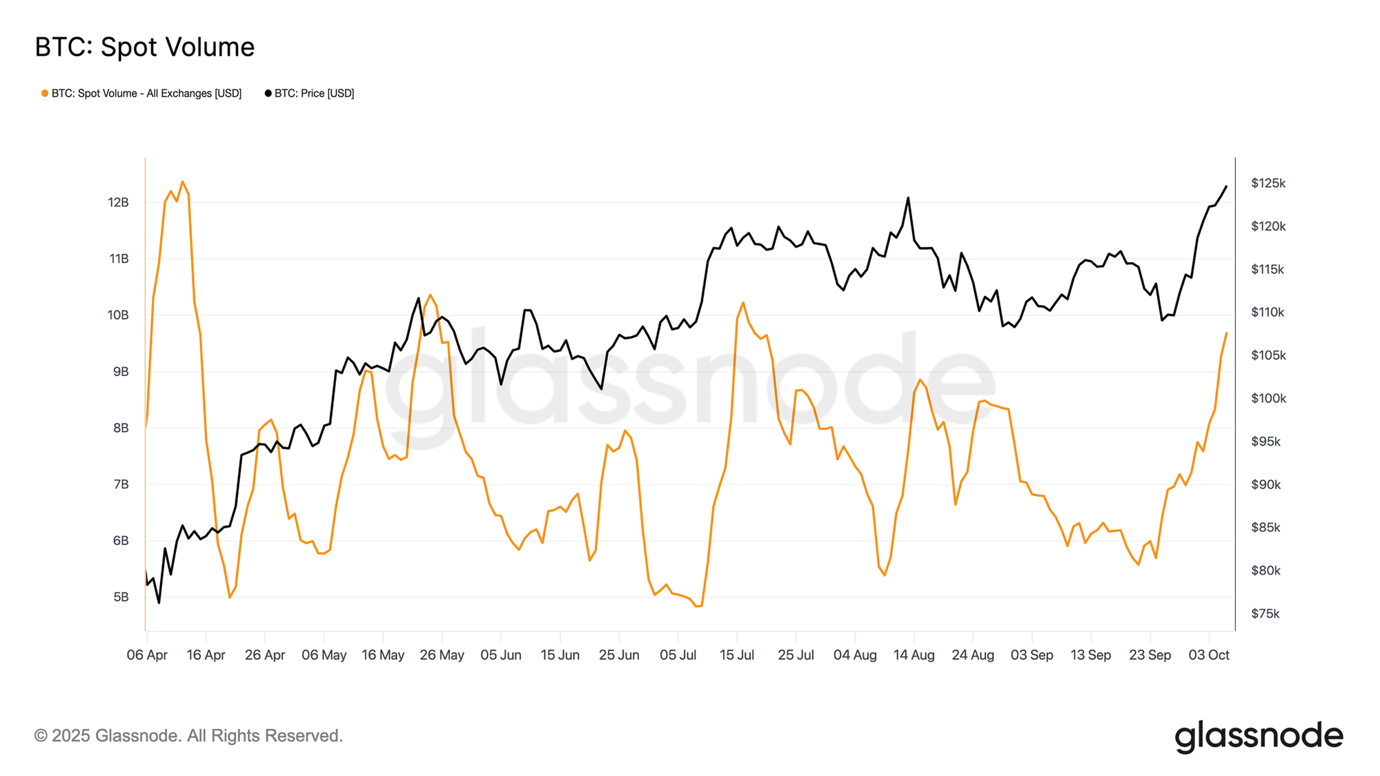 随着ETF资金流重新点燃需求,现货市场的交易活动同步激增。日均现货交易量已攀升至自4月以来的最高水平,确认市场参与度回升及流动性加深。
