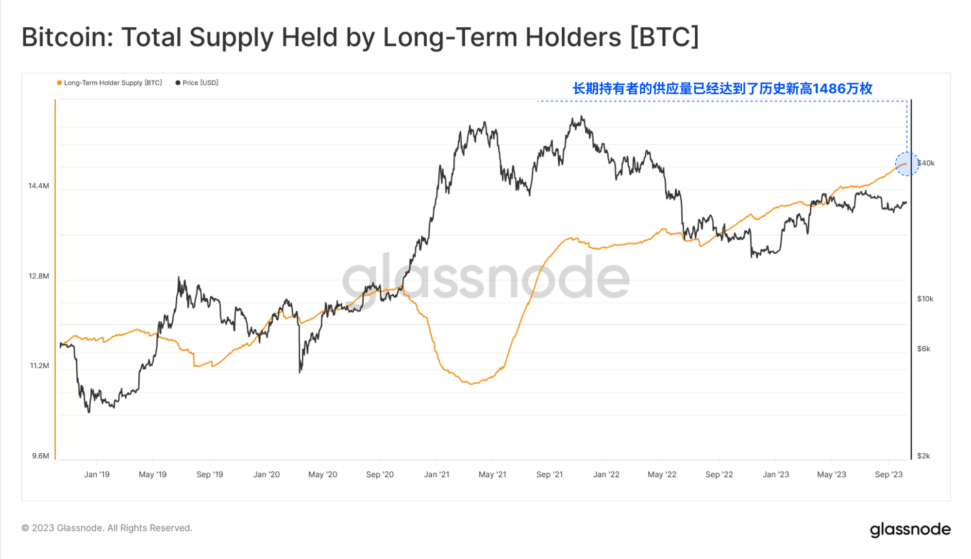 我们可以从长期持有者供应量的角度来看这一点,达到历史新高,超过1485.9万枚比特币。意味着近76.1%的比特币在过去五个月都未发生交易。