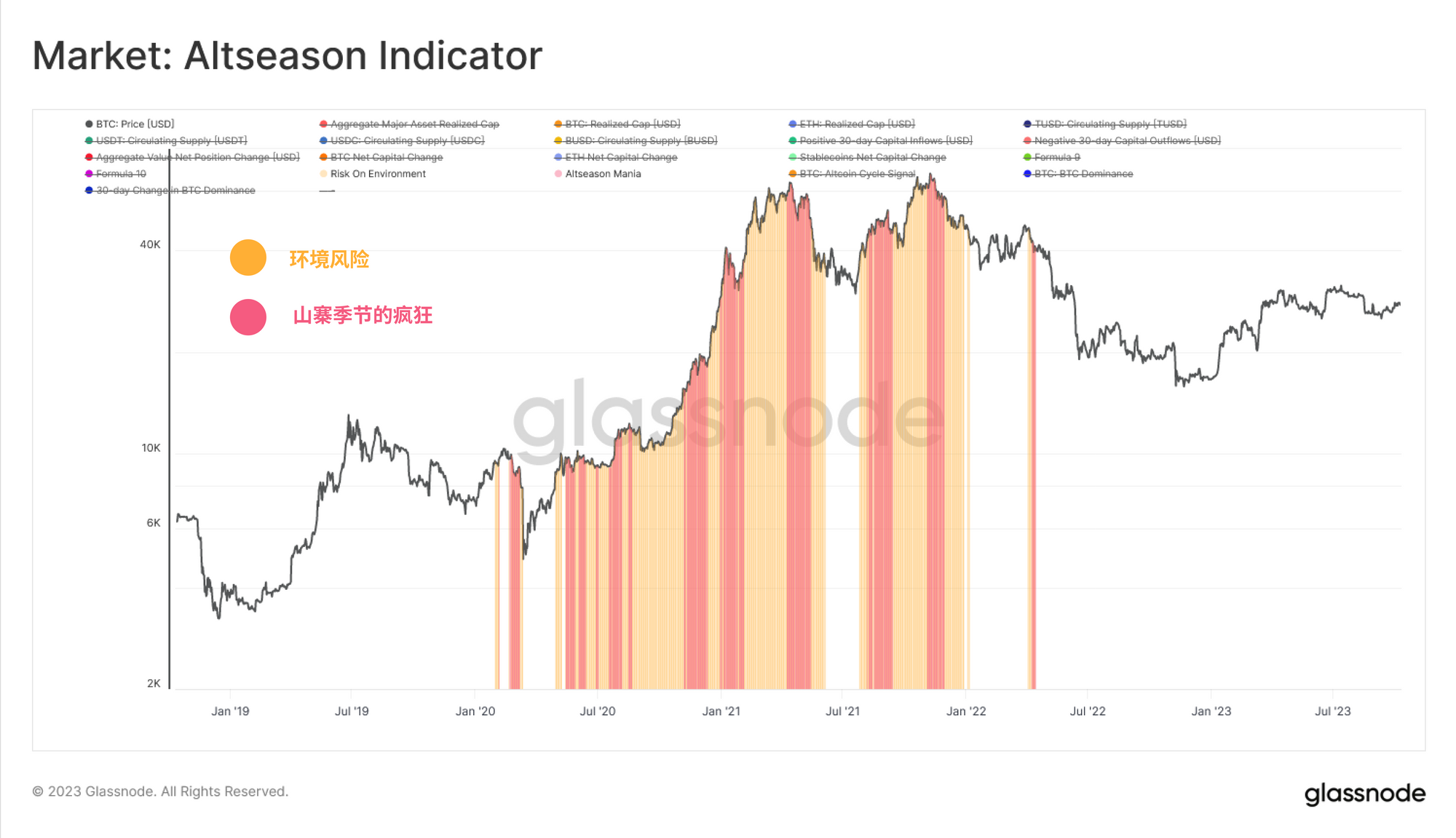 - "山寨币季节狂潮" 的峰值风险是指流入以太坊和稳定币的资金都是正的且不断增加。