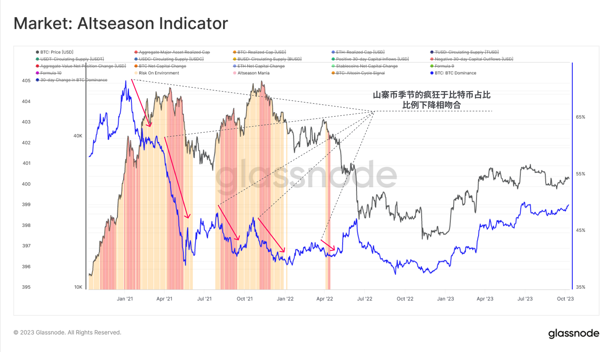 为了验证这一观察是否准确,我们将此数据与比特币的市场主导地位的30天变化进行对照,发现当“山寨币狂潮”指标达到顶峰时,比特币的市场主导地位确实出现了显著下滑。