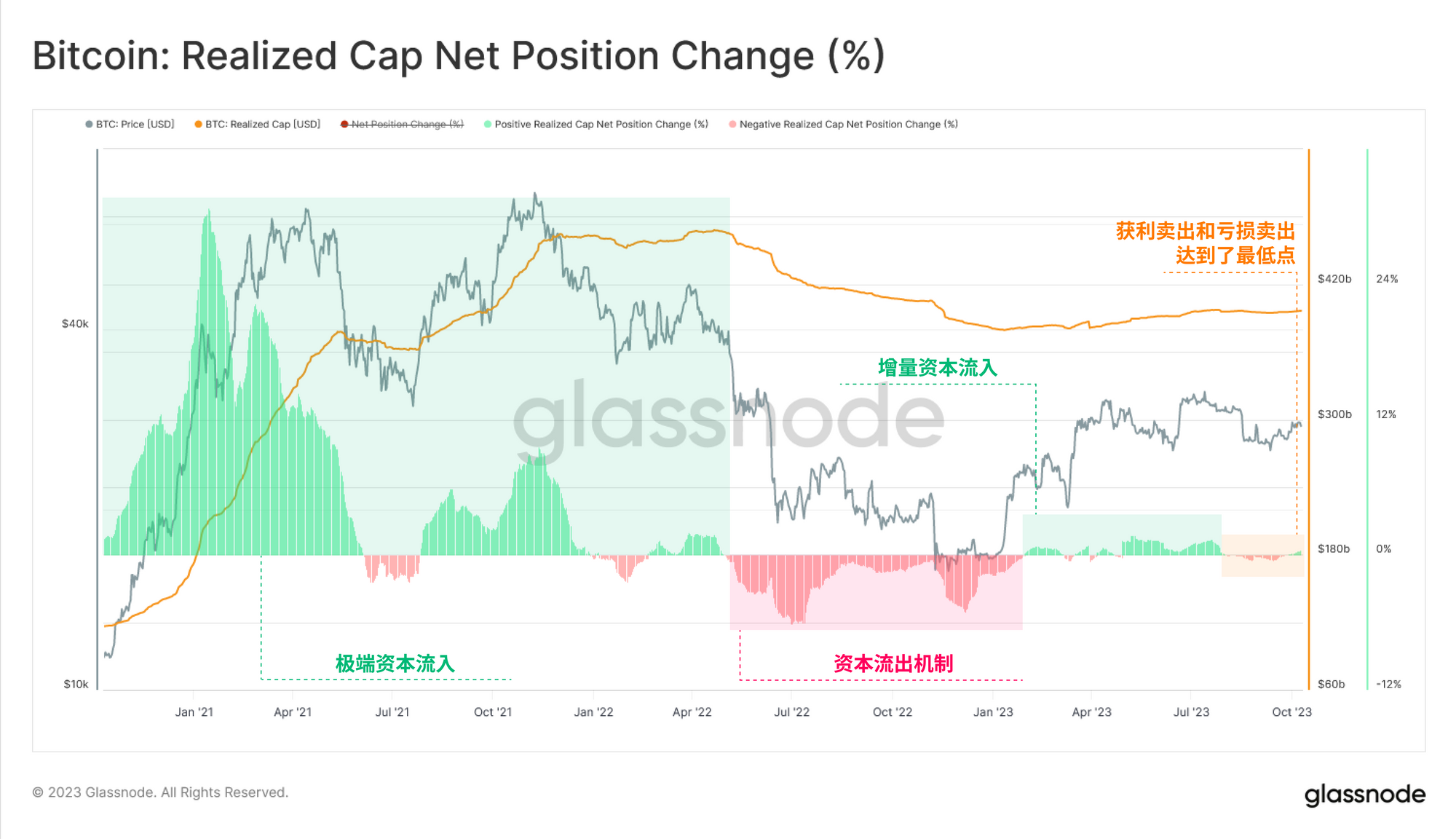 随着已实现市值的横盘,这表明在链上转移的比特币中,只有极少数比特币的收购价格出现了显著的净变化(即最小的获利或亏损事件)。