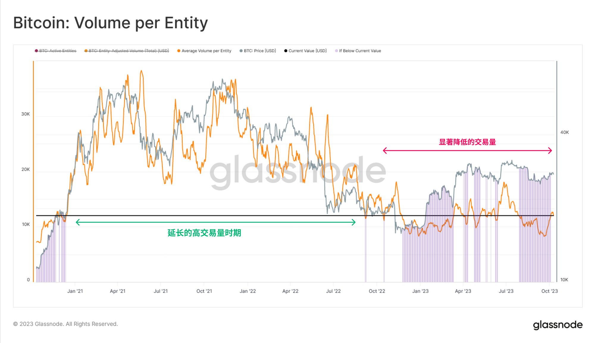 对于市场上的活跃实体,他们的比特币平均转移量也显著下降,现已达到约1.22万美元(大致为0.44 BTC),这一指标已恢复到2017年底(牛市末期)和 2020年底(上一轮牛市开始之前)的水平。