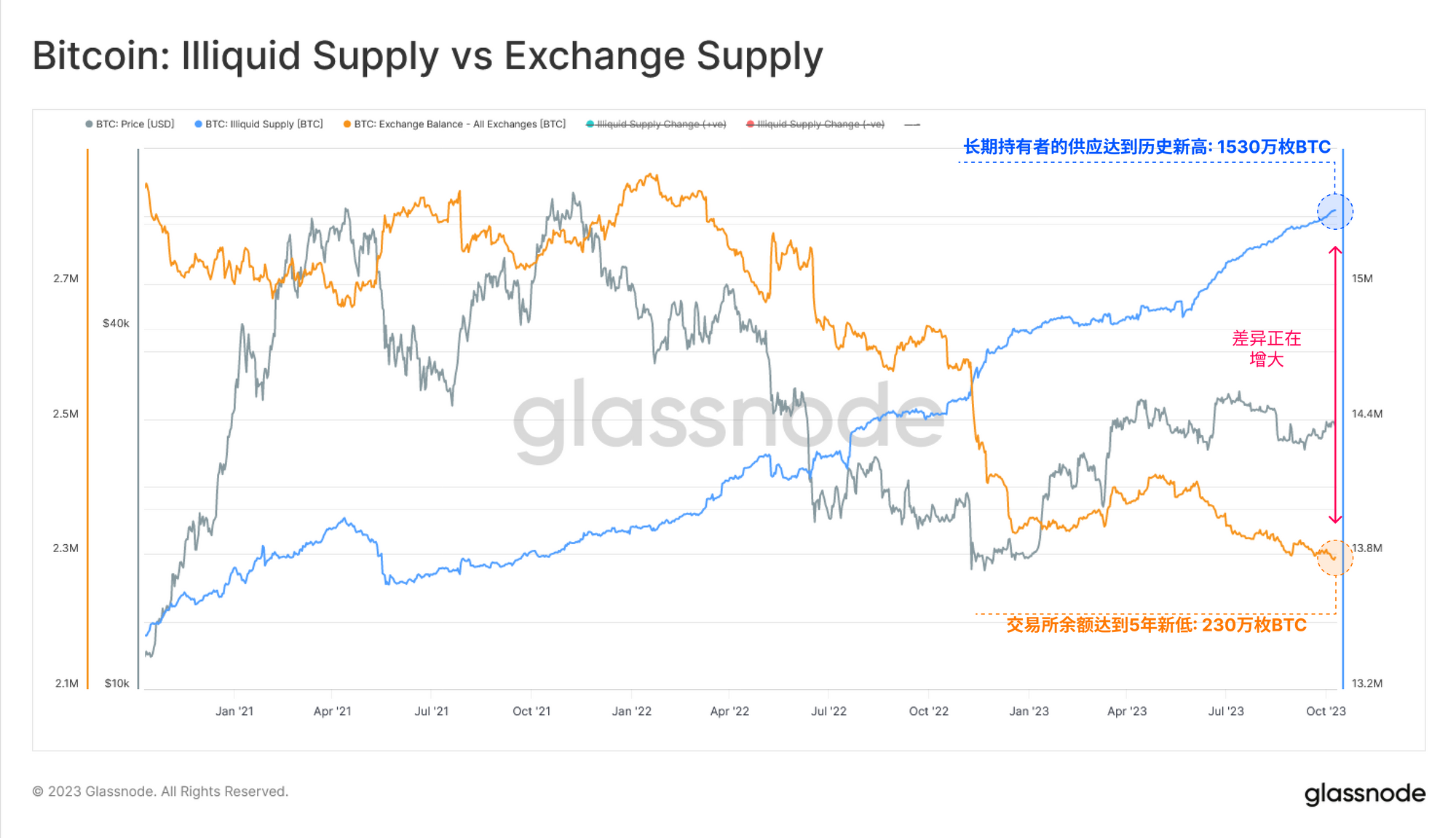 非流动性供应量也在持续上涨,与交易所总余额呈现反向趋势。