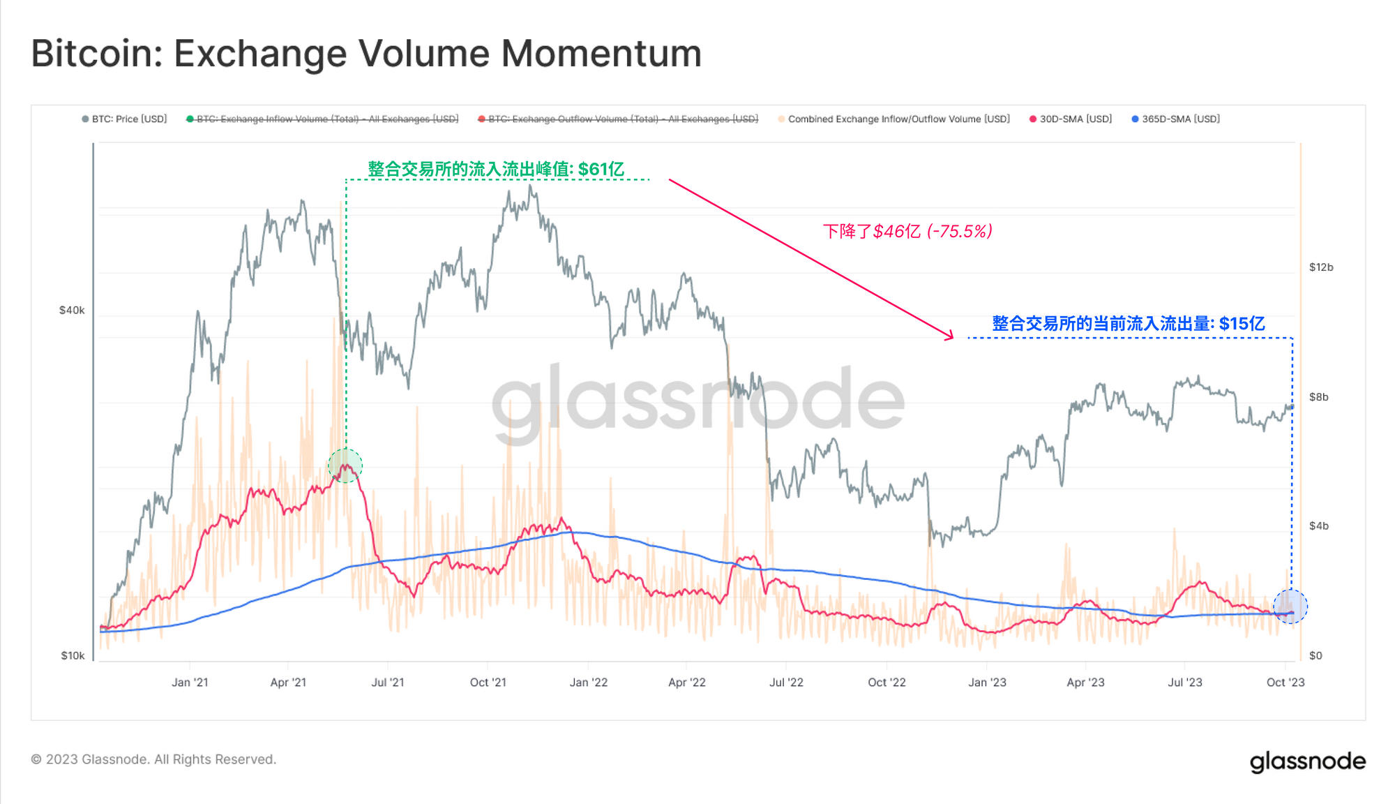 近30天与365天的交易所总交易量(包括资金流入与流出)的平均值约为15亿美元。与2021年5月的60亿美元相比,下降了巨大幅度,降幅达到75.5%。