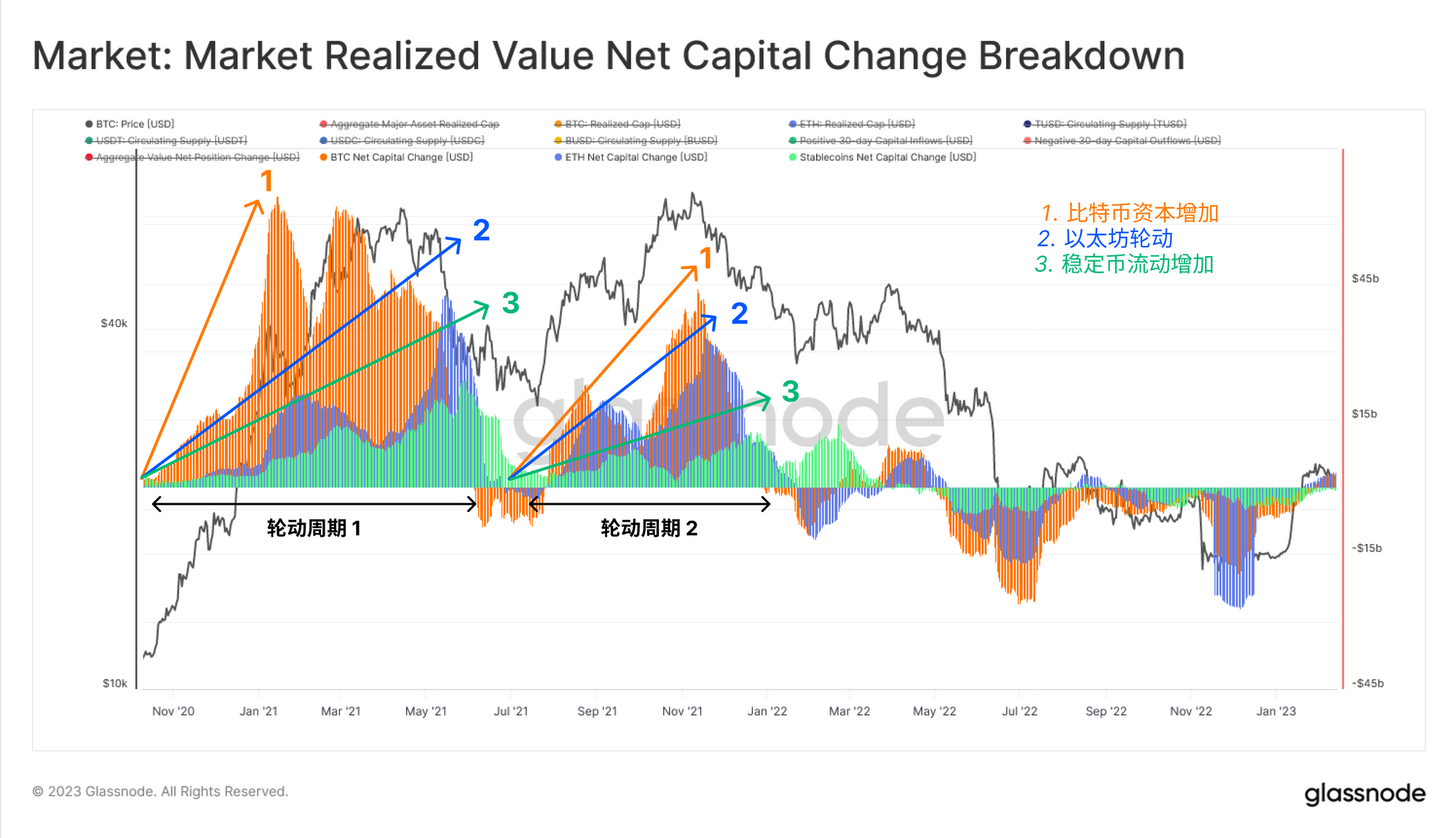 结合🟠比特币与🔵以太坊的30天已实现市值变动,以及🟢稳定币的总供应量(代表美元报价的资本,主要用于投机行为),能够直观地展现资本的流向。