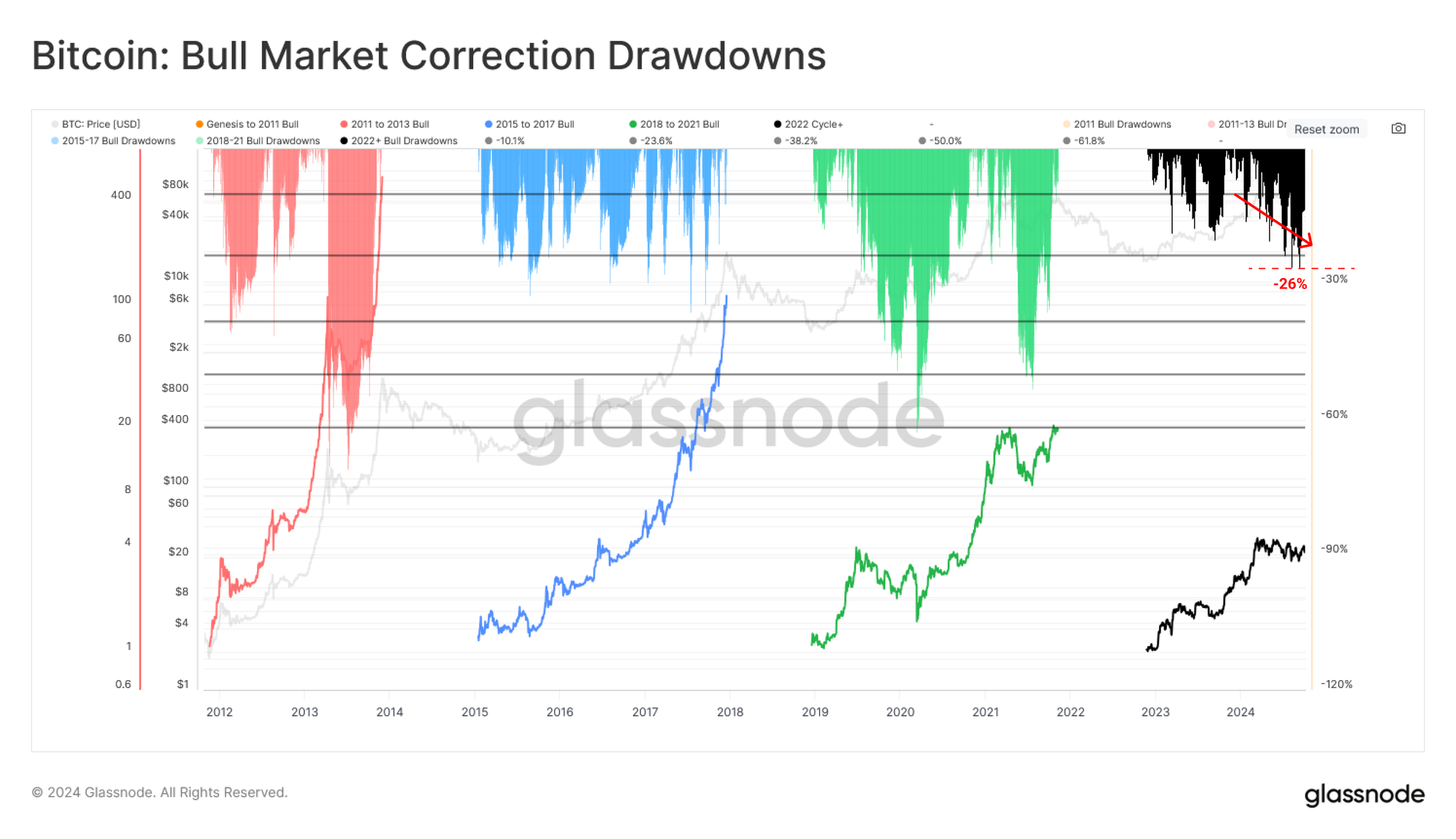 - 牛市回调幅度仍然相对较小,但与历史牛市的上升趋势一致。这突显了当前周期的相似性及其相对的韧性。