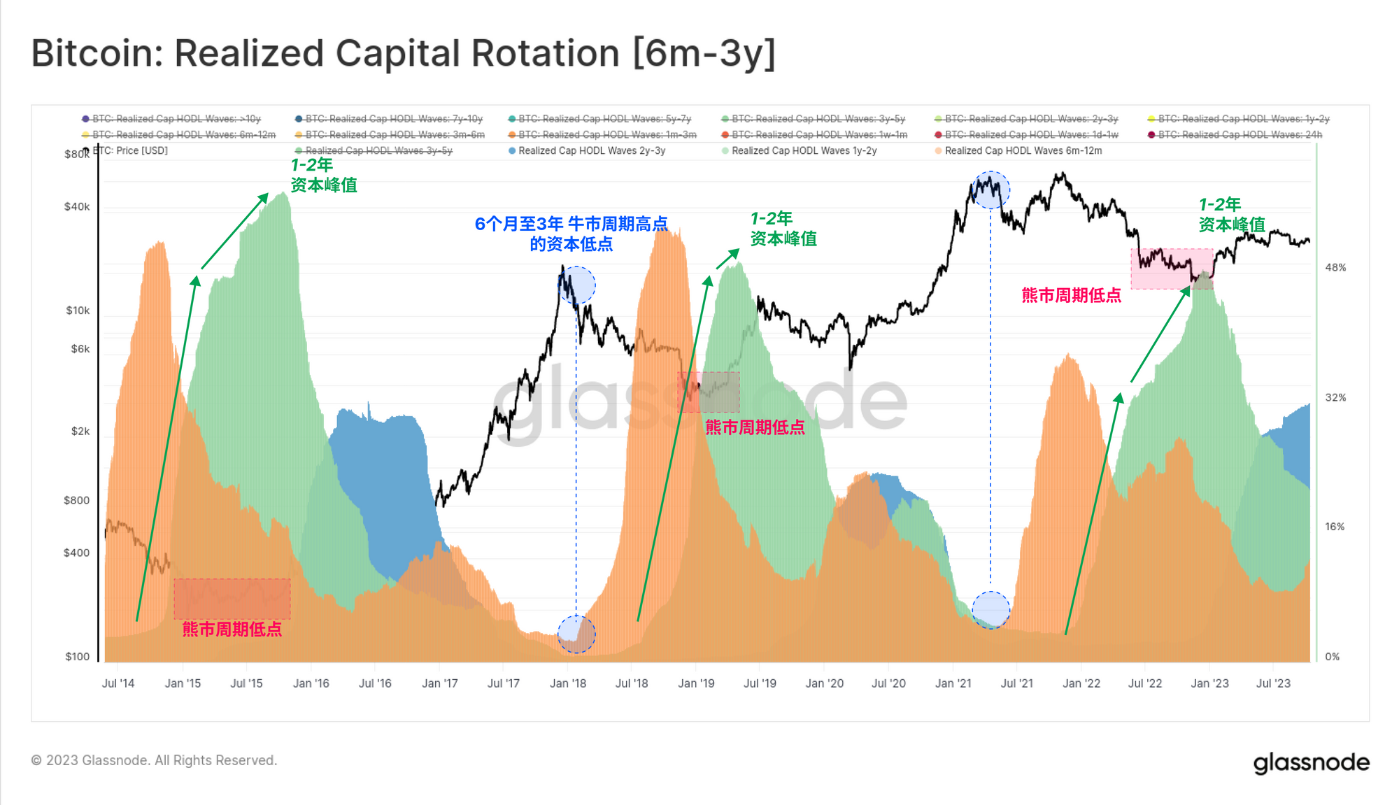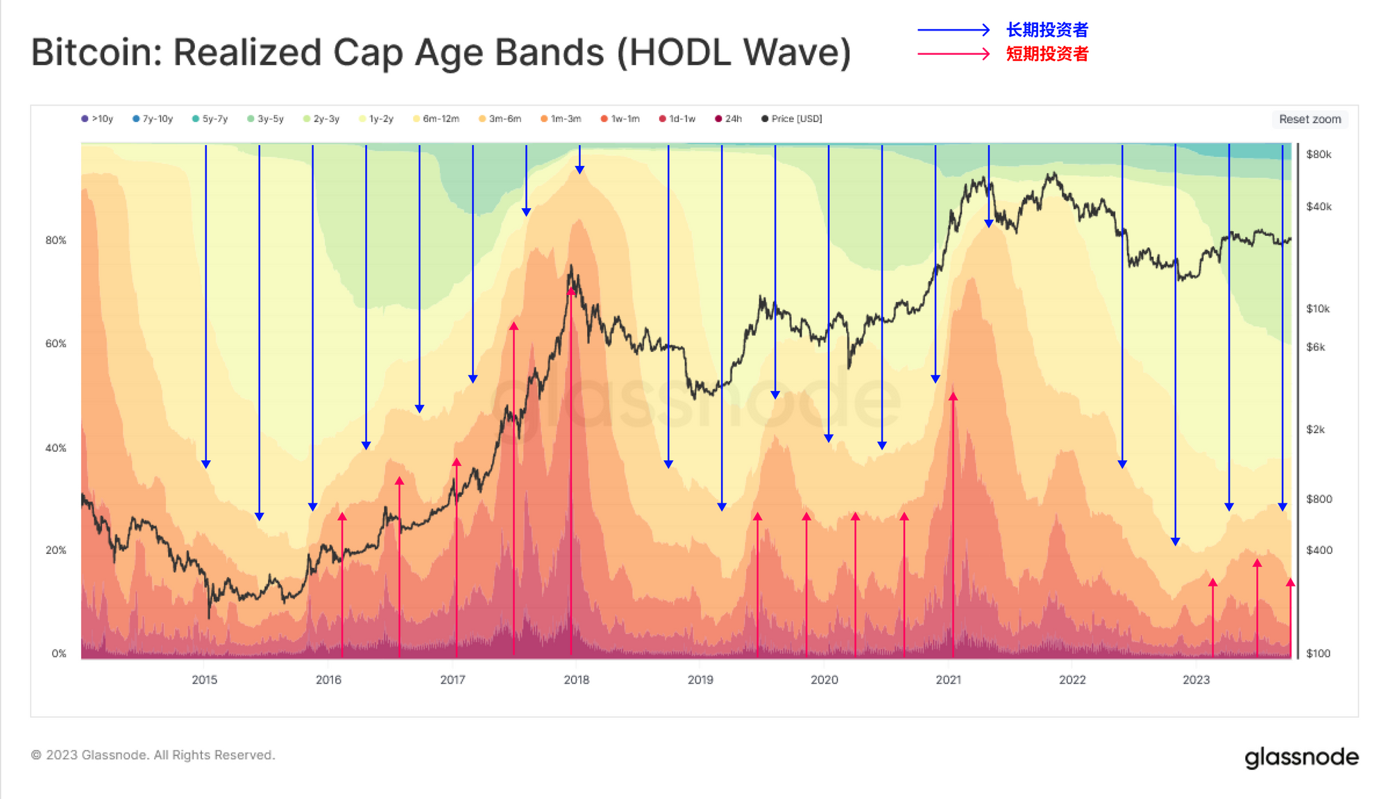 - 🔵 在市场上行阶段中 旧币被耗尽,并从长期持有者手中转移到新投资者手中 (较暖色的波段扩大,较冷色的波段收缩)。