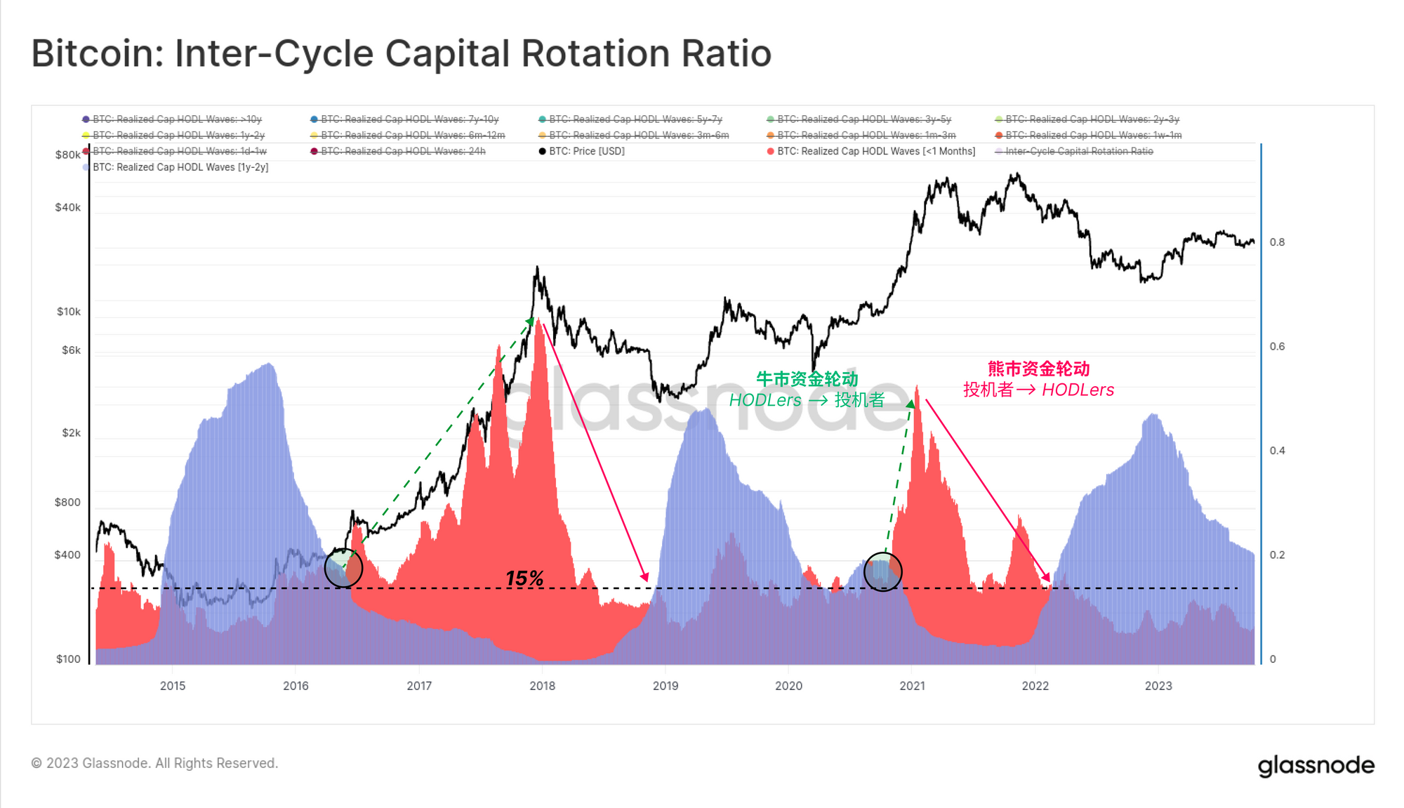 这一现象可以通过观察“已实现的HODL波动”来得到验证,该指标揭示了不同持币时间段的资产分布变化(占已实现市值的比例)。随着资本在投资者之间的流动,该工具直观地展示了市场供需力量的变化。