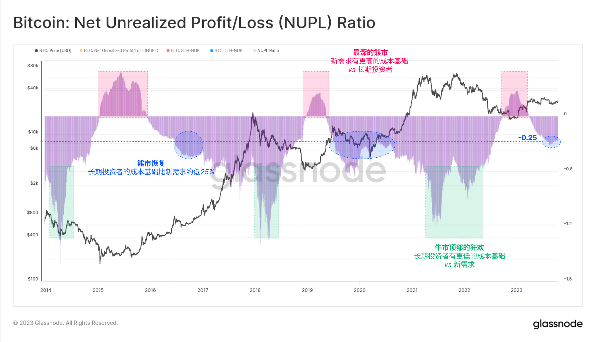 这个 NUPL 比率🟪 根据现有供应量(长期投资者)与新需求量(短期投资者)之间的偏差,为驾驭市场周期提供了一个具有洞察力的指标。在2023年第三季度,NUPL比率已跌至-0.25的区间,这与2016年和2019年的走势极为相似,标志着典型的熊市恢复时期。