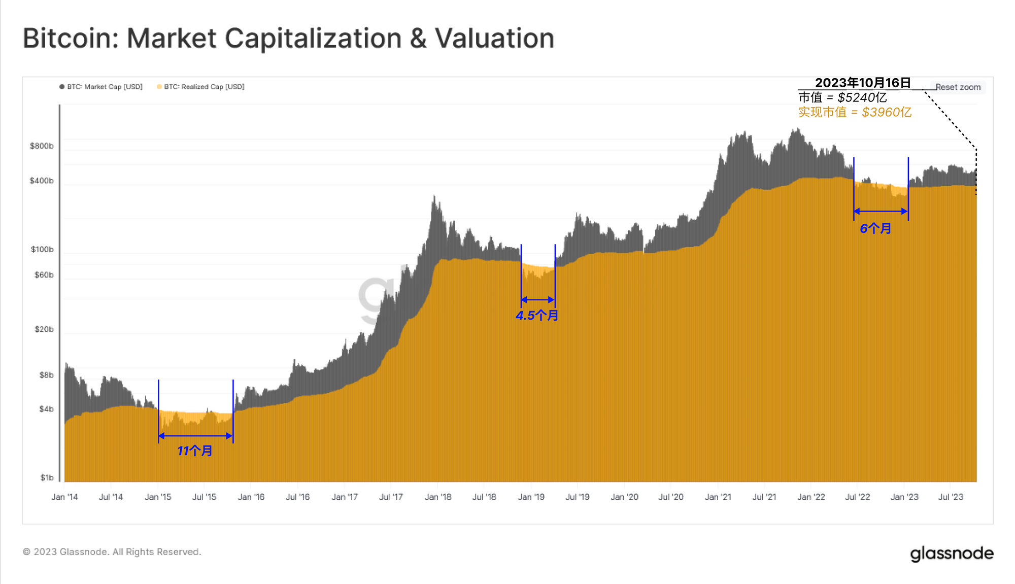 在2022年的下半年,有长达六个月的时间里市值都低于已实现市值。此后,市值回升至5240亿美元,而已实现市值为3960亿美元。