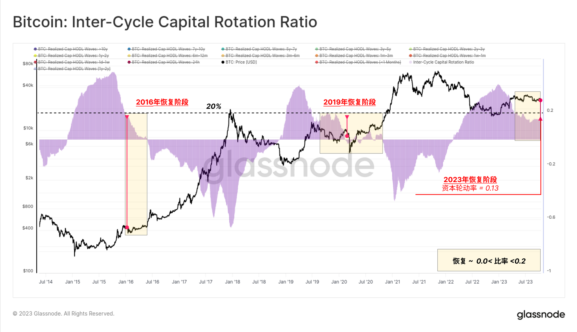这个周期间资本轮换比率 🟪显示如下,目前的交易水平为 13%,与 2016 年和 2019 年的水平类似。这表明,比特币供应仍然主要由囤币党群组主导,现在绝大多数币的币龄都超过了 6 个月。