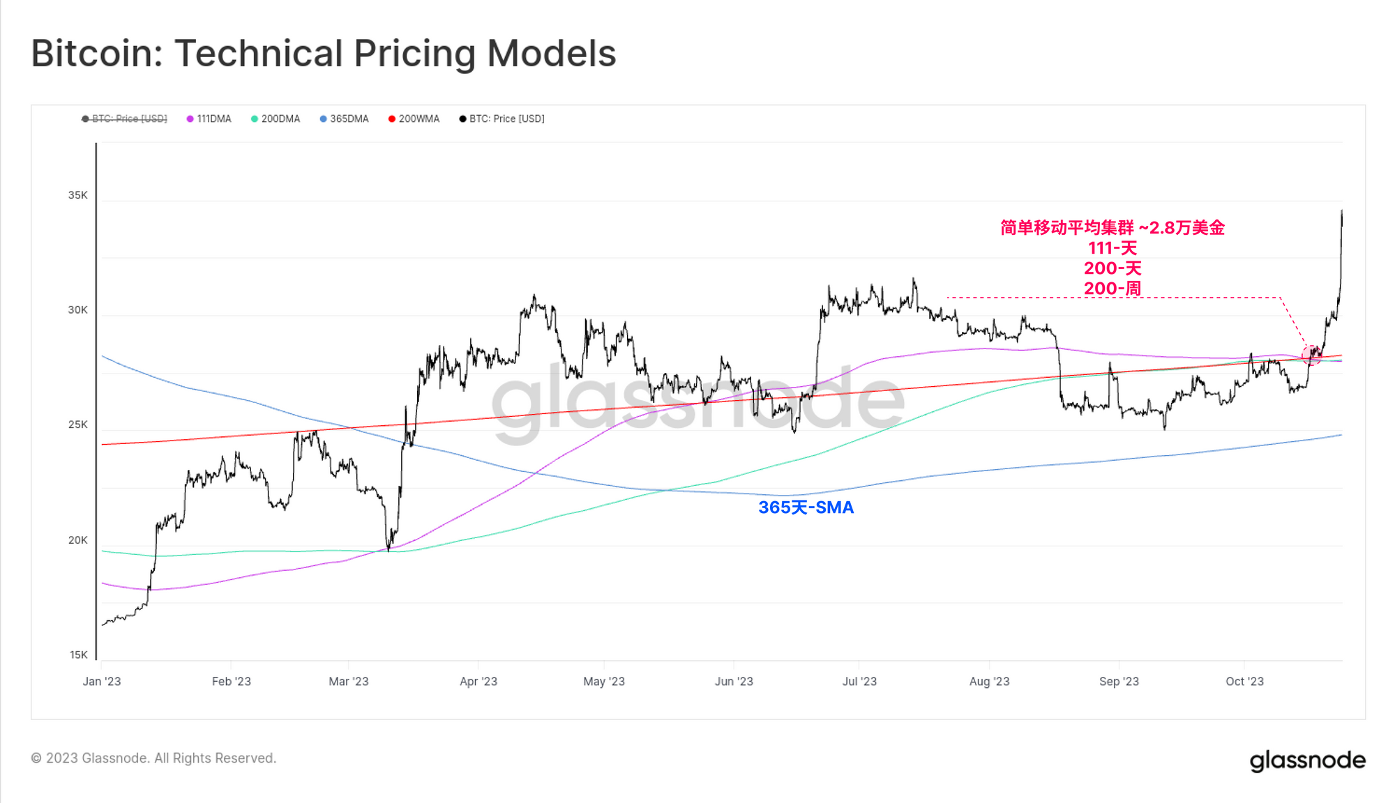 价格的一组长期简单移动平均线位于2.8万美元附近,在9月和10 月都为市场提供了关键的支撑。经过一个月的调整,多头在本周找到了足够的力量,比特币成功突破了111日、200日和200周均线。