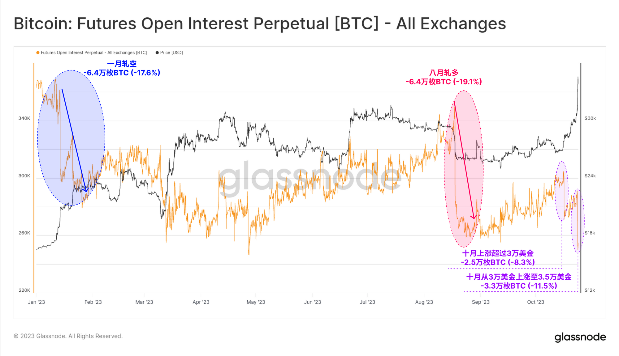10月17日,未平仓合约确实减少了约2.5万枚比特币,降幅约为 8.3%。随后,随着市场反弹至35000美元的年内新高,10月23日又出现了 35000枚比特币的第二次大规模杠杆冲销。目前,这种杠杆挤压的程度类似于1月份的轧空和8月份的轧多。