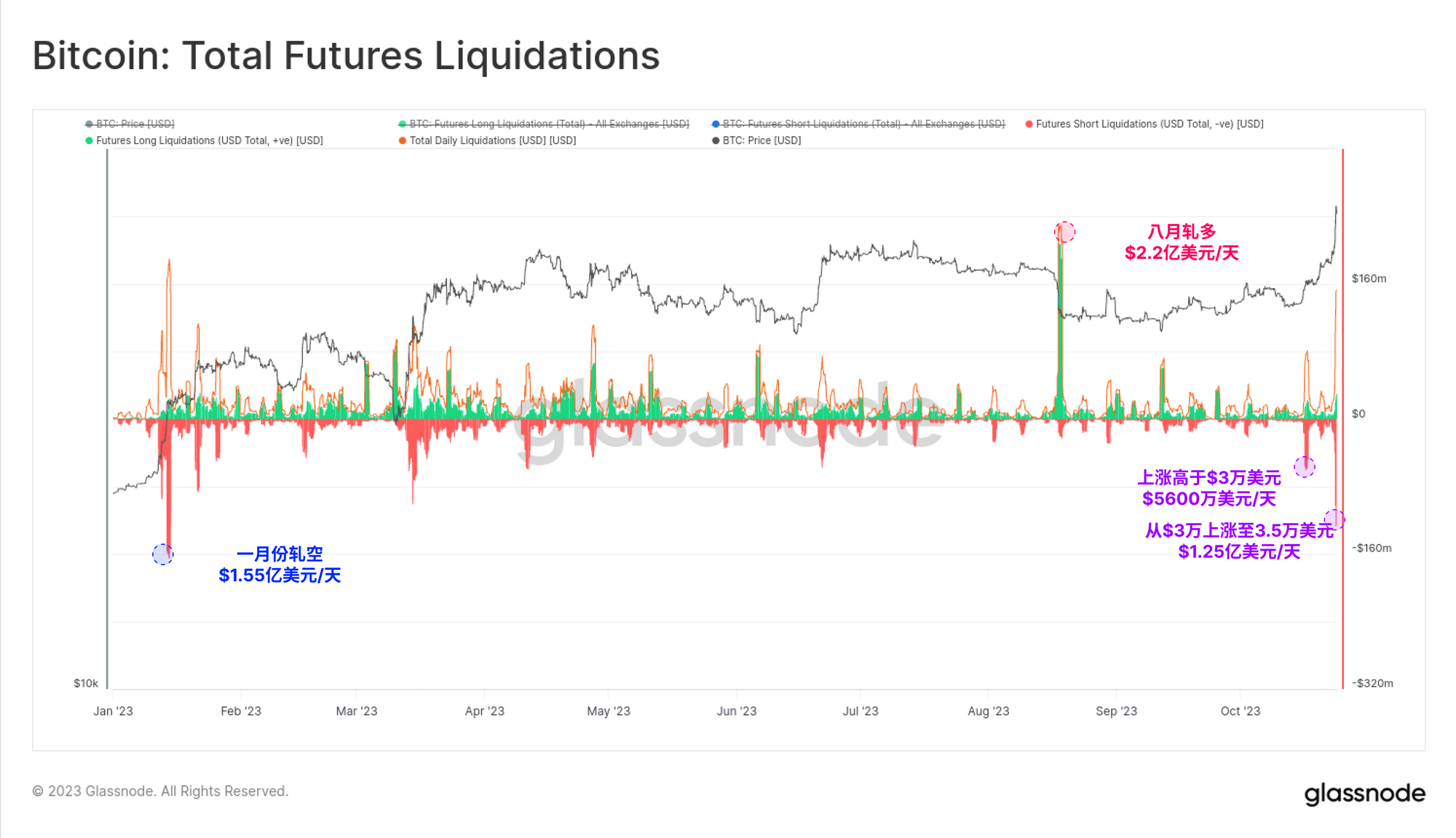 10月17日反弹启动时,约有5,600万美元的空头头寸被平仓,10 月23日又有1.25亿美元的空头头寸被平仓。 在2023年的背景下,这是一个重大的空头清仓量。这与1月份1.55亿美元的空头平仓和8月份2.2亿美元的多头平仓又不相上下。