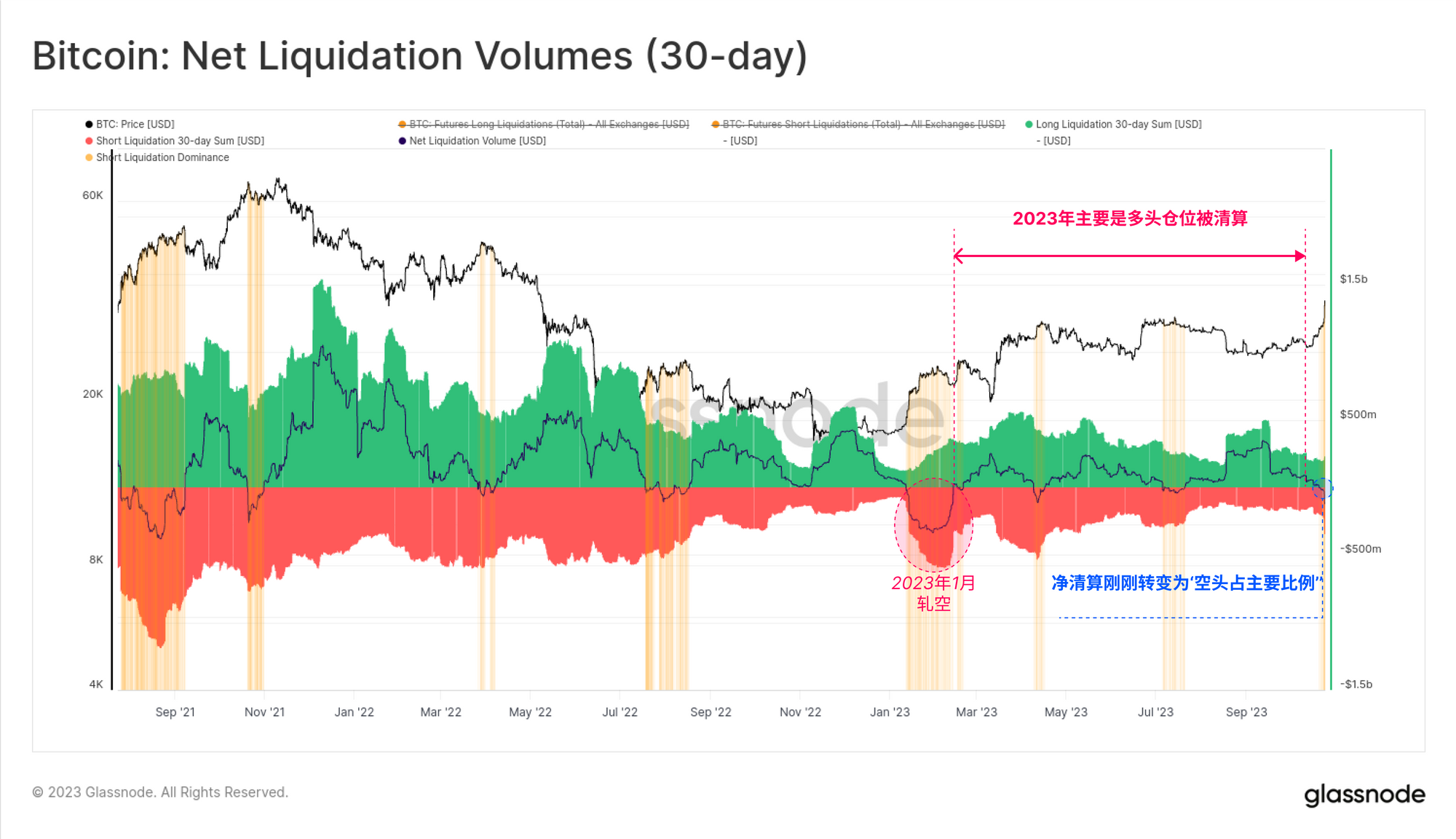 我们可以用另一种方法检查期货清算量,即计算30天内清算的多头和空头的总和,并计算净余额。我们可以看到,与空头相比,2023 年的大部分时间(实际上也是历史上的大部分时间)都是多头平仓量更大。