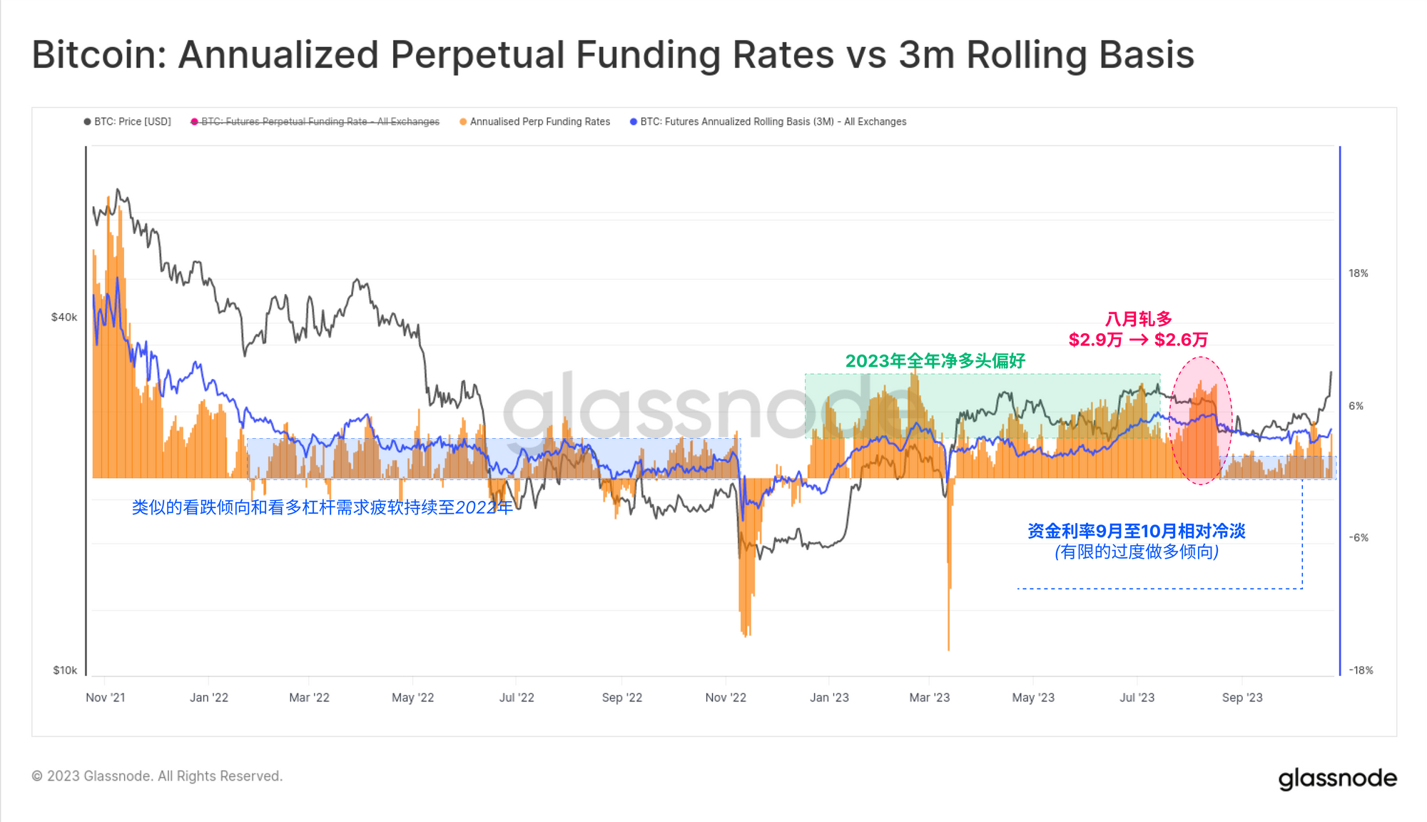 8月的抛售行为大大降低了这种长期偏见,永续资金利率从7.5%以上下跌到+2.5%。尽管本周短暂的强压反弹期间资金利率有所上涨,但相对来说仍然较低,这表明此次上涨可能只是部分受到杠杆的驱动。