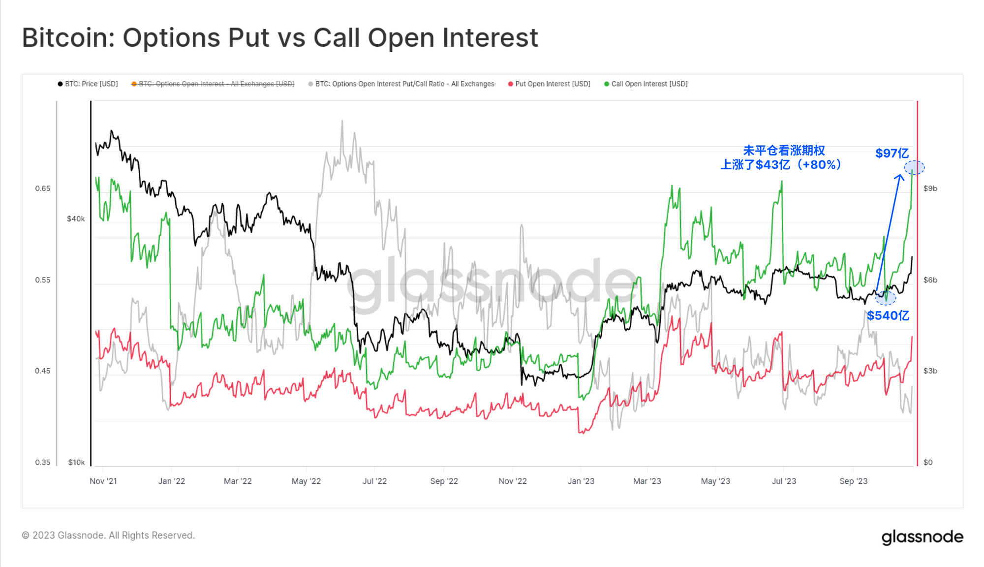 然而,期权市场仍然是投机资本的目的地。看涨期权的未平仓合约增加了43亿美元,增长了80%,总额达到了97亿美元以上。这表明交易员和投资者继续将期权市场作为做多敞口的首选工具。这在比特币市场结构中是一个相对较新的发展,现在期权市场与期货市场的规模相当(见链上周报第32周)。