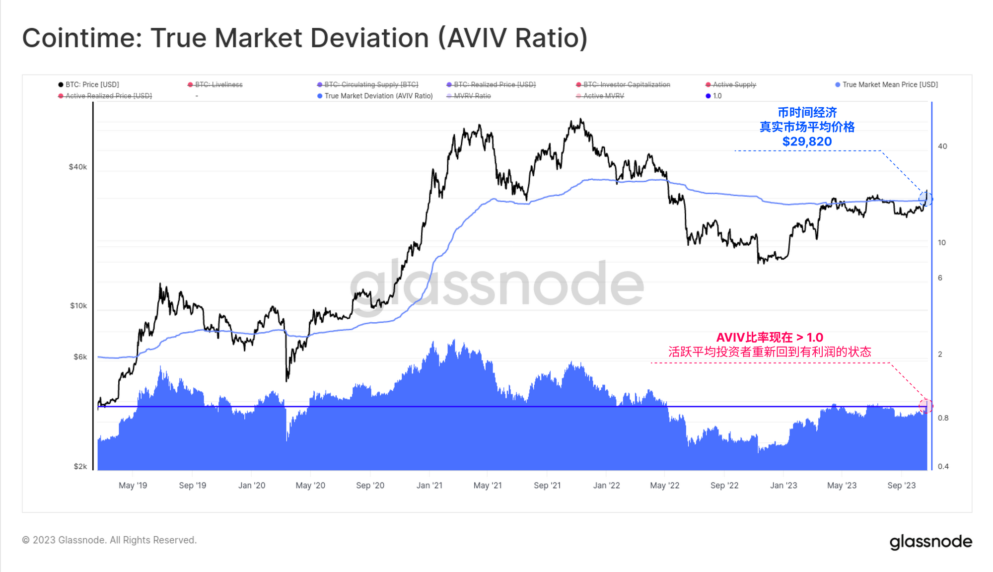 由于市场已经突破了2020-22 年周期的中点(见 第28周周报),并且交易价格高于真实市场均价,这使得平均活跃的比特币投资者重新获得了未实现的利润。