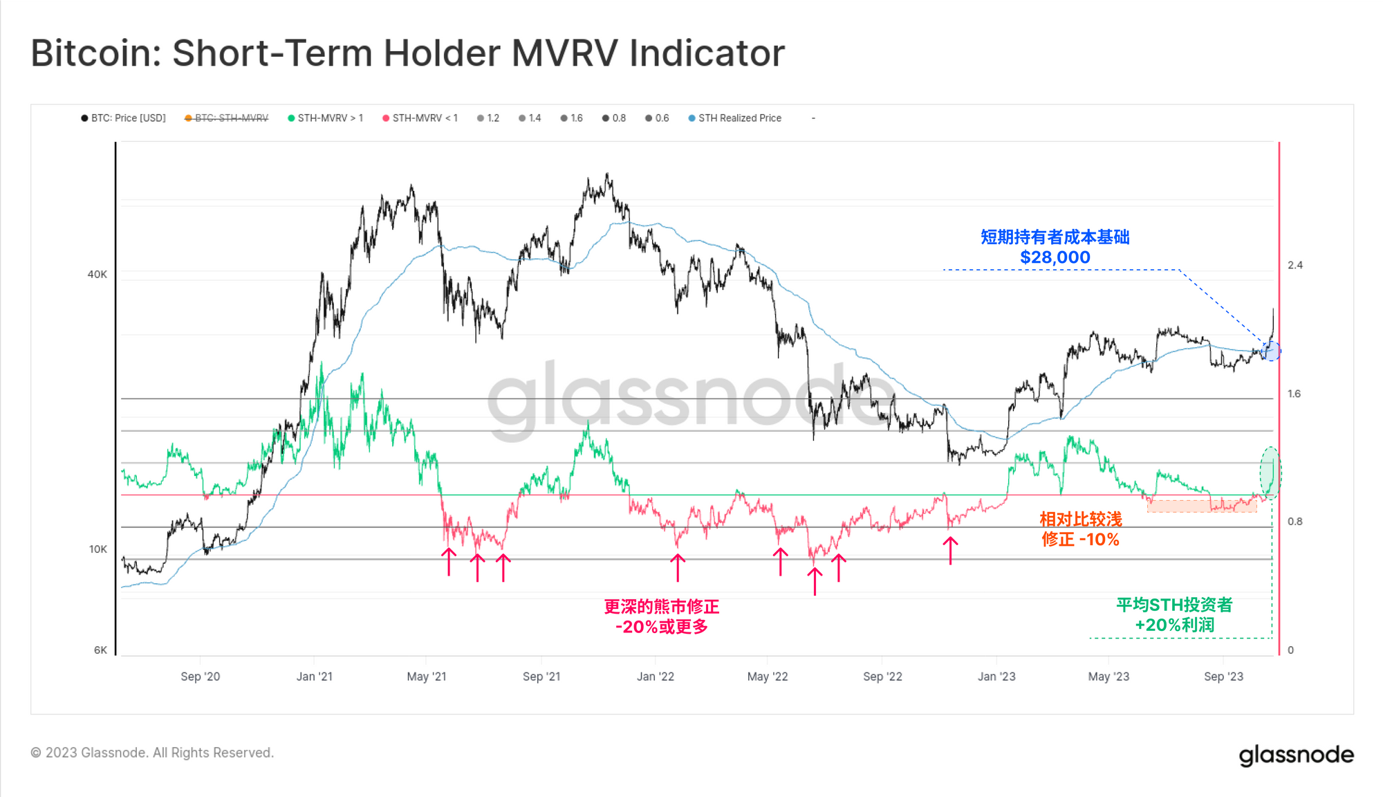 我们可以看到在2021-22年,STH-MVRV达到了相对较深的-20%或更多的修正。尽管8月的抛售低点达到了-10%,但与之比较,这次MVRV的下降是值得注意的,这表明近期的修正找到了显著的支持,是本周上涨的前兆。