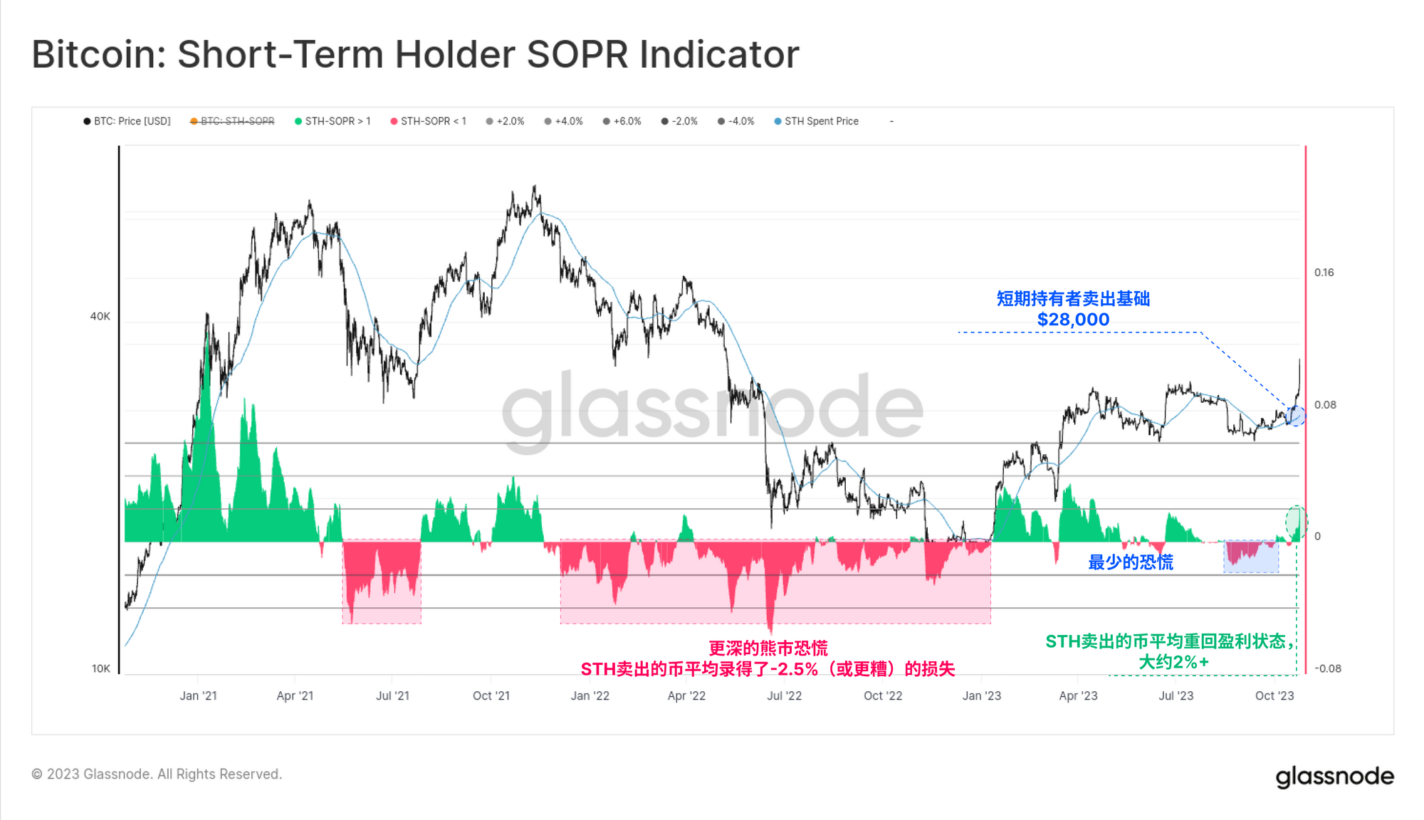 短期持有者(STH)的成本基准现在也已经跌至$2.8万以下,使平均近期投资者的平均利润达到+20%。下面的图表显示了STH-MVRV比率,其中红色代表市场交易价格低于STH成本基准的时期,绿色则表示价格高于它的时期。