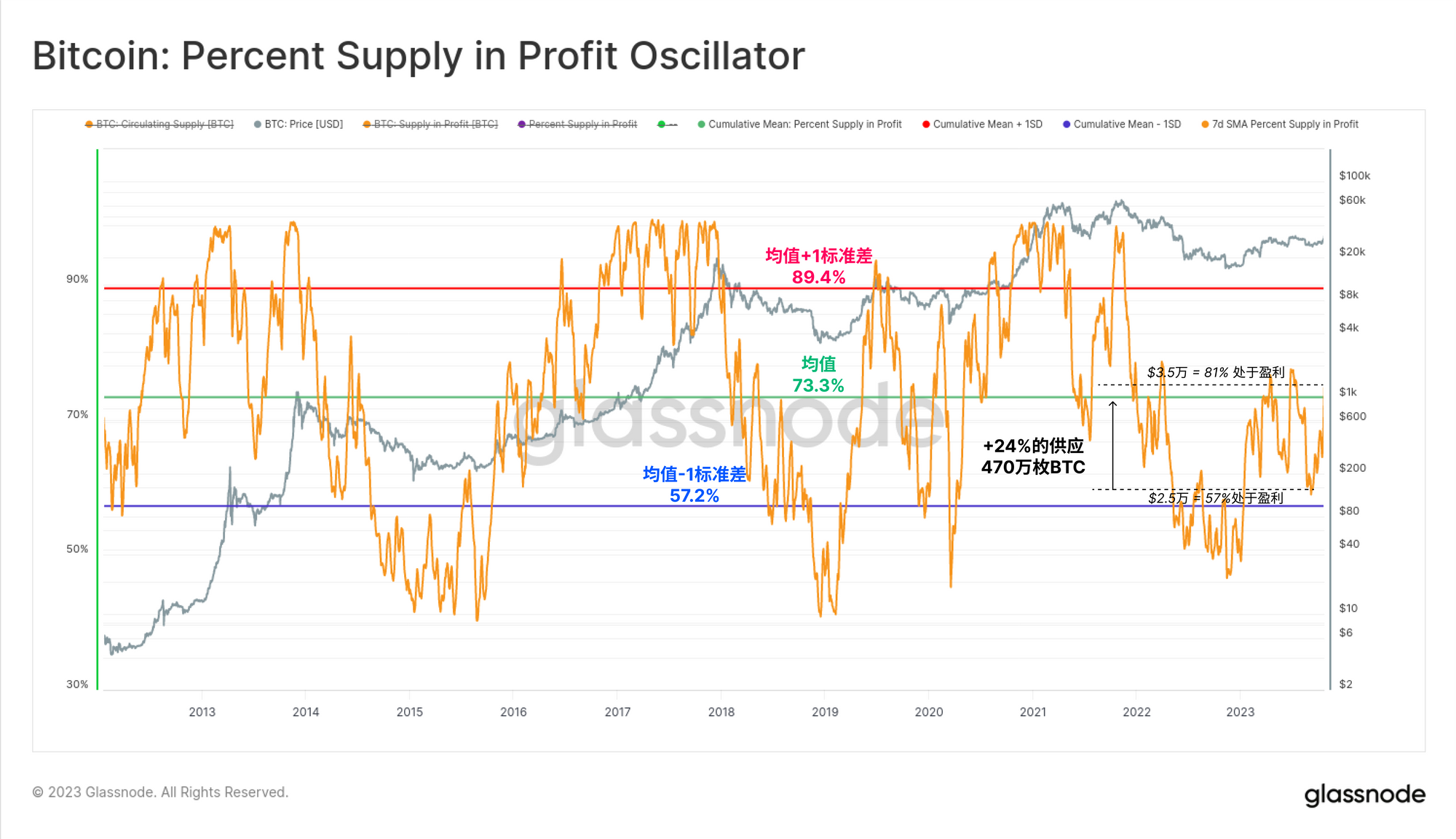 目前,81%的供应量已实现盈利,市场现在已经回到正轨,这一指标现在已经高于这一指标的长期平均水平(显示为绿色)。