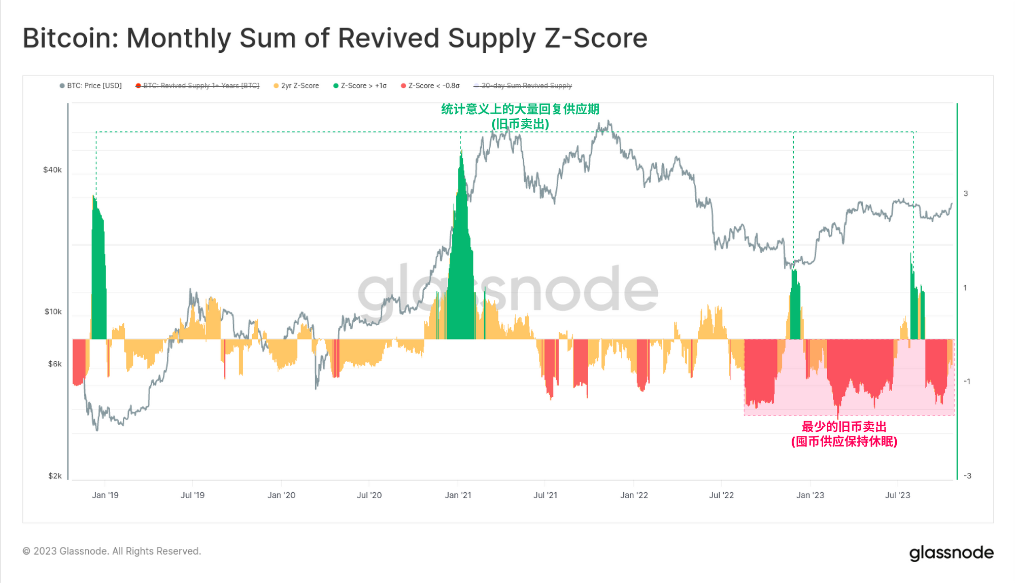 最后,我们将查看 “复活供应 "指标的 Z-Score(2 年期)转换。我们正在寻找的时期是,持有时间超过1年的币相对于前2年(一个减半周期的一半)被卖出的速率在统计上显著。