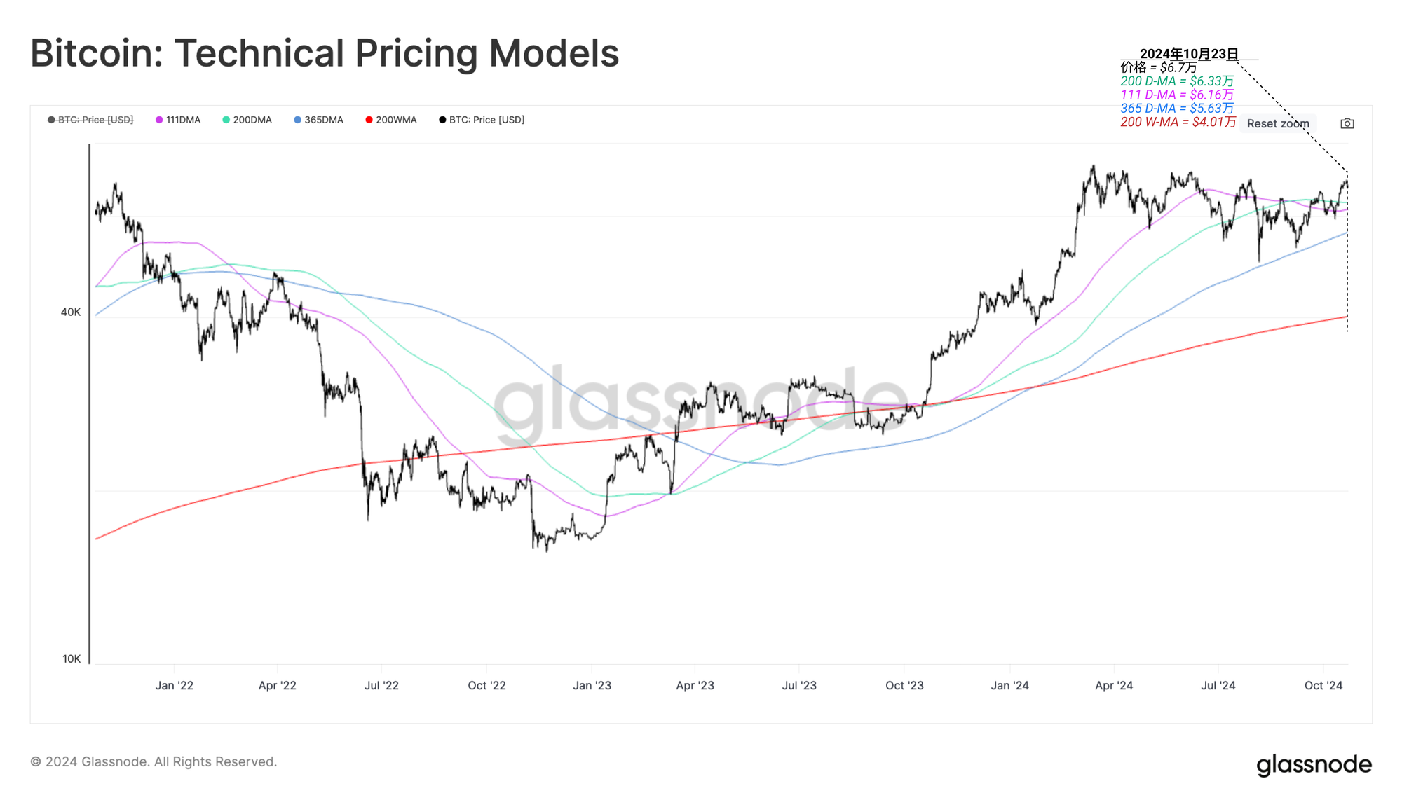 我们还可以通过比较现货价格和关键技术定价水平来进一步了解市场的韧性。这次反弹见证了市场突破了 200 天移动平均线(200DMA🟢)和 111 天移动平均线(111DMA 🟣)的双重阻力,比特币投资者通常对这些指标有所反应。