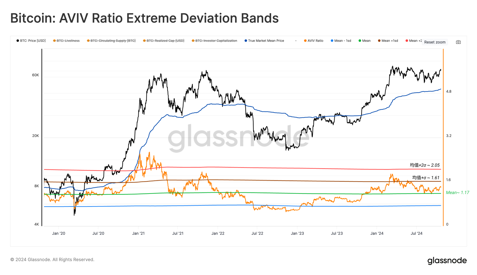 AVIV 比率是链上分析师工具箱中的一个基础指标,它评估活跃投资者持有的未实现纸面盈亏的规模(通过剔除丢失和长期休眠的供应)。