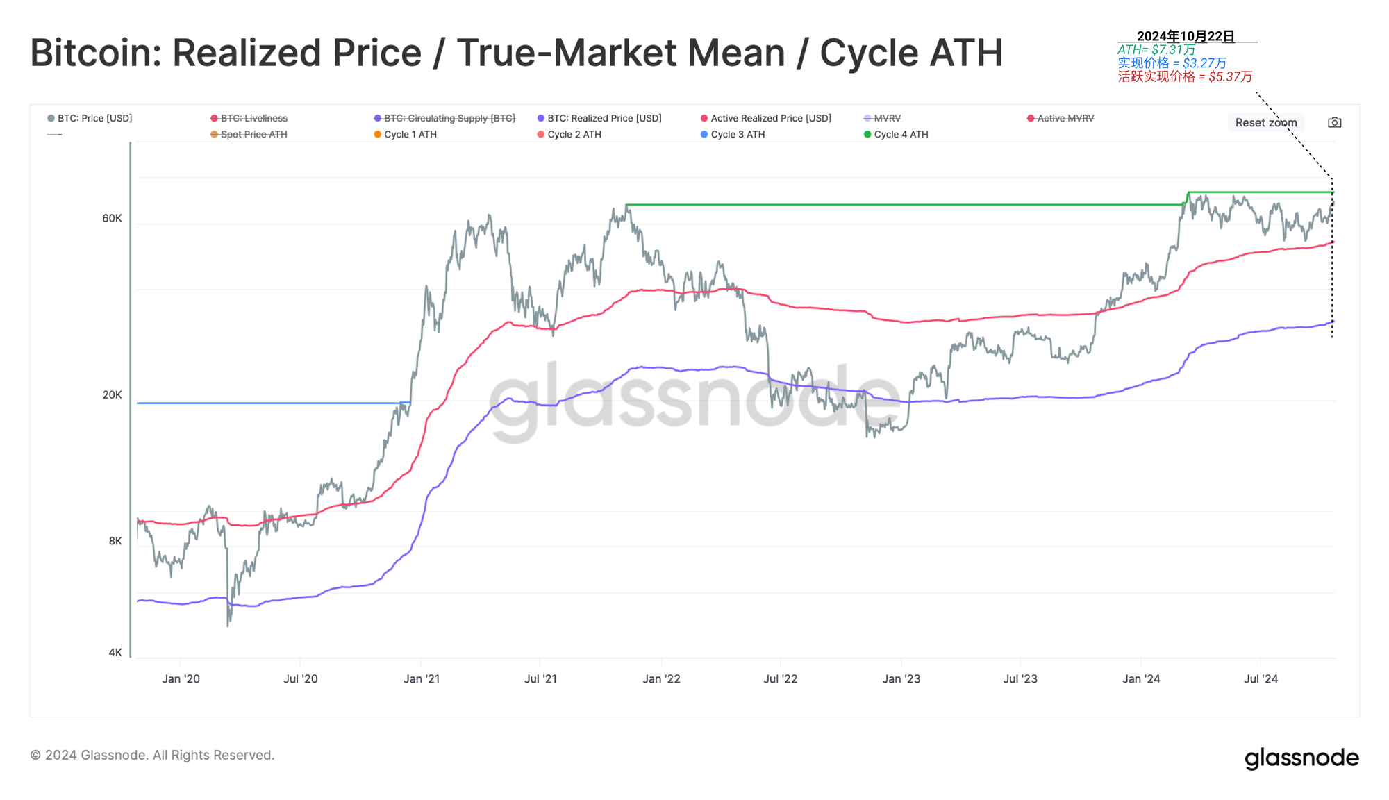- 🔵 早期牛市:价格在实现价格和真实市场均值之间波动。