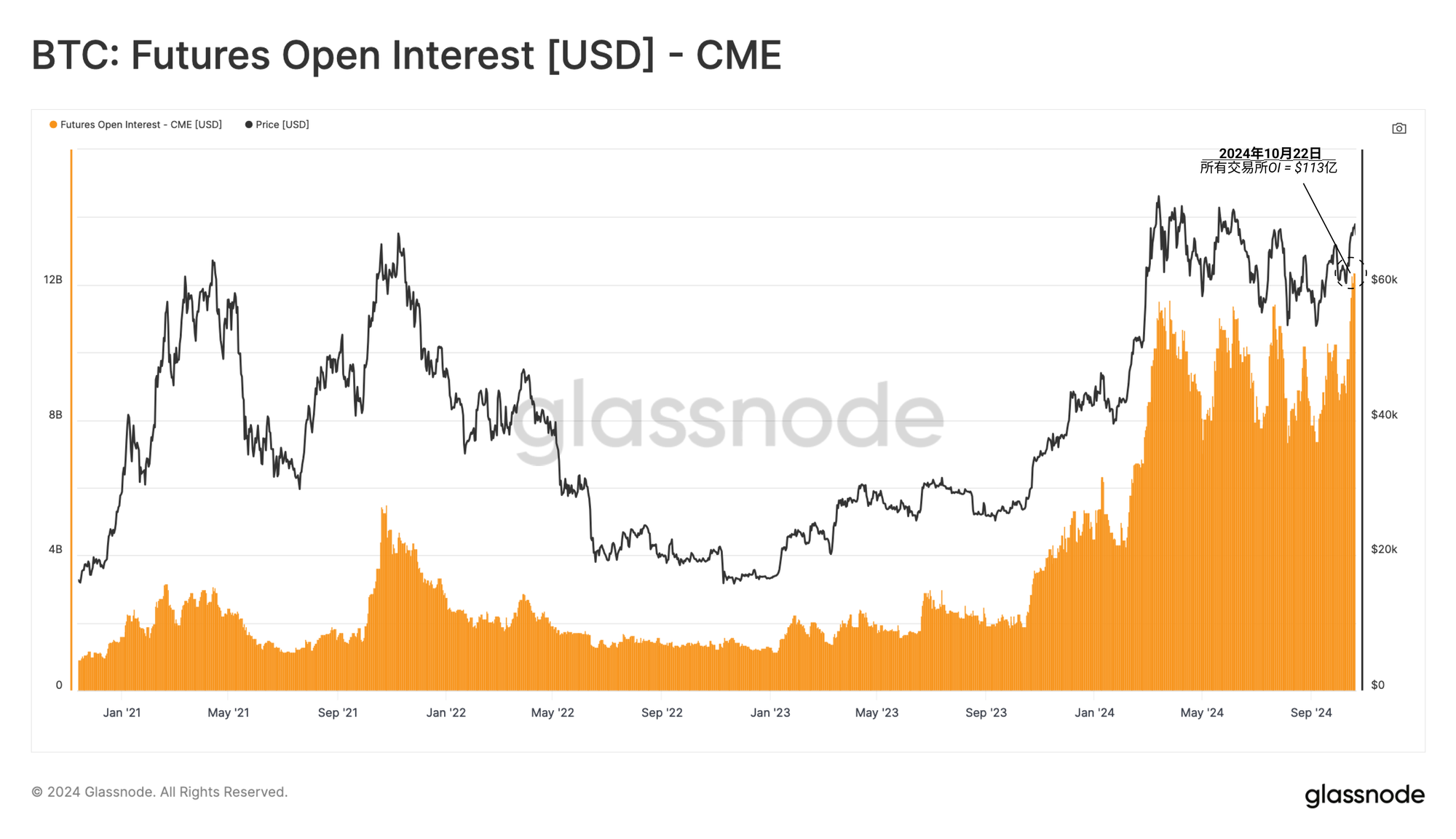 这一产品为新一波机构投资者提供了一种受监管的衍生品敞口工具,并提供了通过现金和套息交易获取收益的机会。CME 合约的未平仓合约飙升至 113 亿美元的新高,突显了机构投资者在数字资产领域的活跃度增加。
