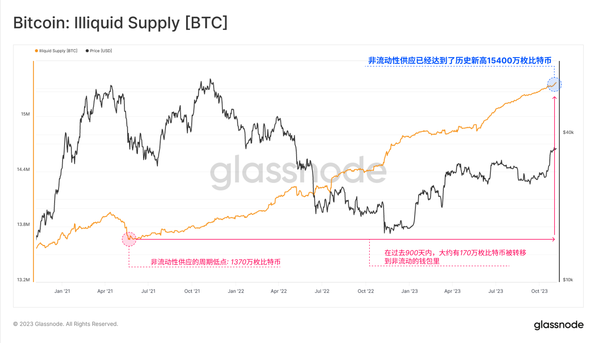 非流动性供应指标(Illiquid Supply)衡量的是钱包中持有的供应量,其卖出历史记录极少,目前也达到了1540万枚BTC的历史最高值(ATH)。非流动供应量的变化往往与交易所提现同步,这表明投资者仍在继续将他们的币提现到托管账户,自 2021 年 5 月以来,已有超过 170万枚BTC的投资者这样做了。