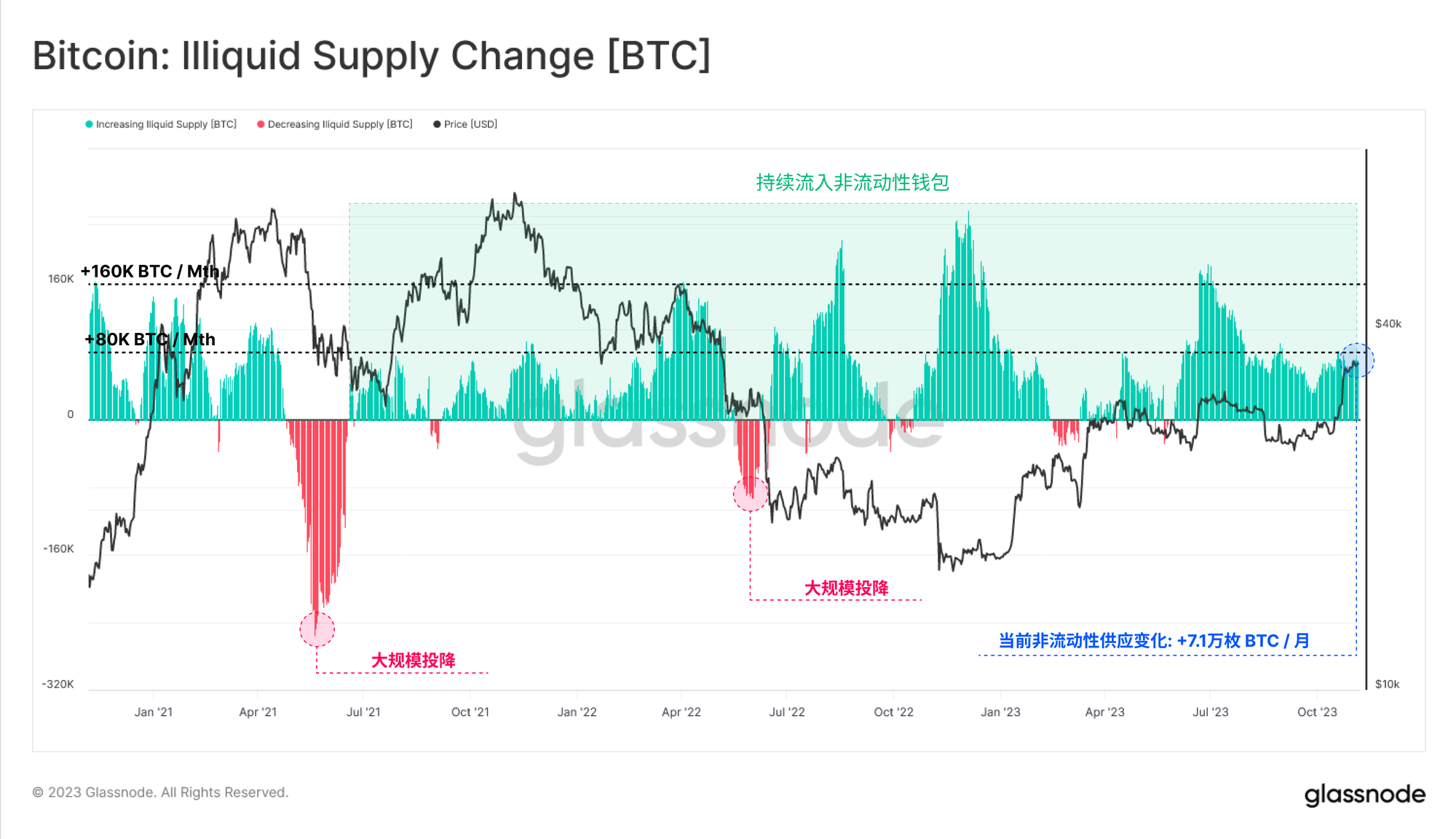 这反映在非流动供应的月变化率上,非流动供应处于多年净增长期,目前的增长率为每月7.1万枚BTC。