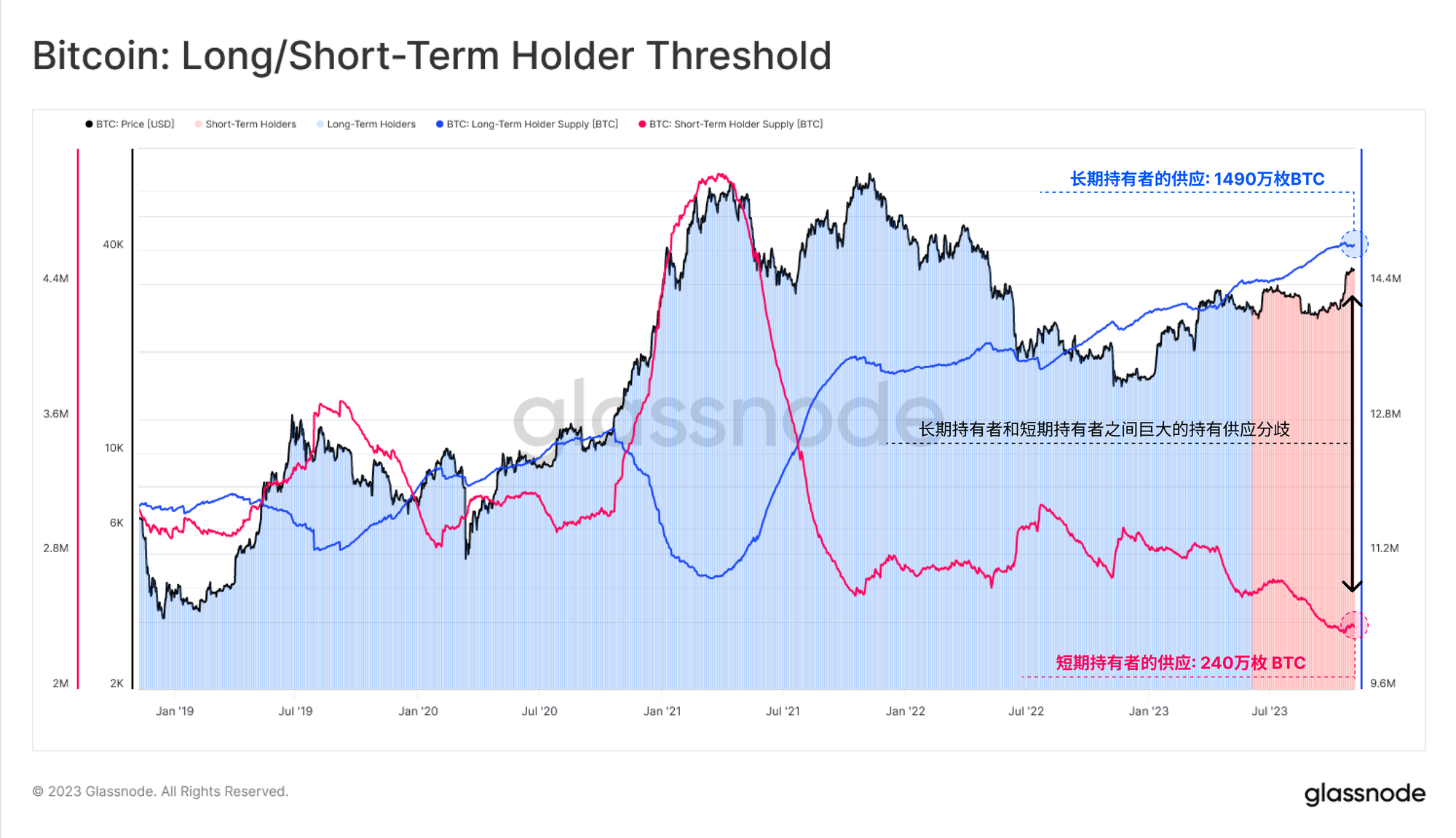 长期持有者 (LTH) 🔵和短期持有者(STH) 🔴的供应量之间继续形成强烈的背离,长期持有者 (LTH) 的供应量接近历史最高点,而短期持有者 (STH) 的供应量实际上处于历史最低水平。这一强洞察力的动态展示了BTC供应的日益紧缩,因为现有持有者变得越来越不愿意出售他们的持有量。