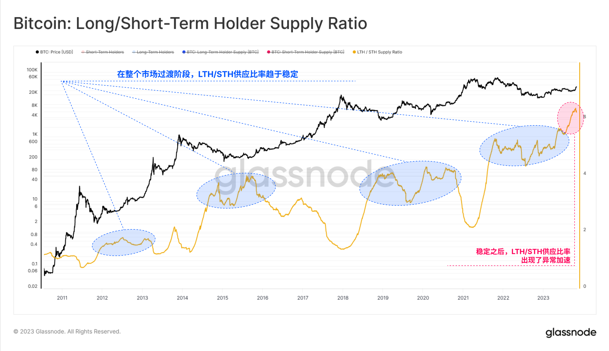 这一指标表明,随着投资者积累和持有他们的币,避免卖出和交易的速度越来越快,BTC 的供应量总体上趋于成熟。