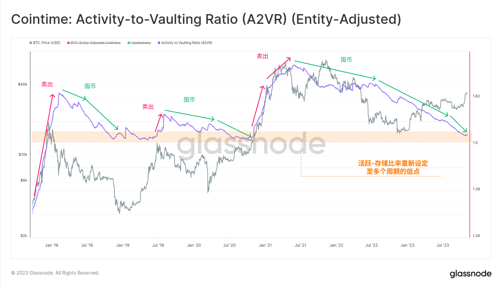 活动到保管比率(A2VR)是一种新的指标,它优雅地在宏观层面上描述了这种分化。它比较了通过投资者持有时间单位(通常是币天或币块)衡量的货币“活动”和“不活动”状态的全部时间平衡。
