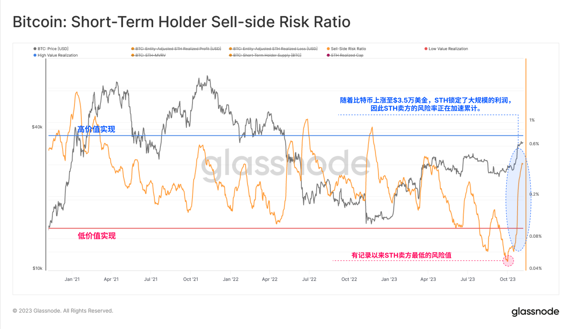 在这种情况下,我们只考虑短期持有者群体,因为他们是日常价格行动的主要驱动力之一。在最近反弹至3.5万美元之后,卖方风险比率从历史低点飙升,这表明许多年轻币种正在 "苏醒"。这说明这批人近期将出现获利了结事件。