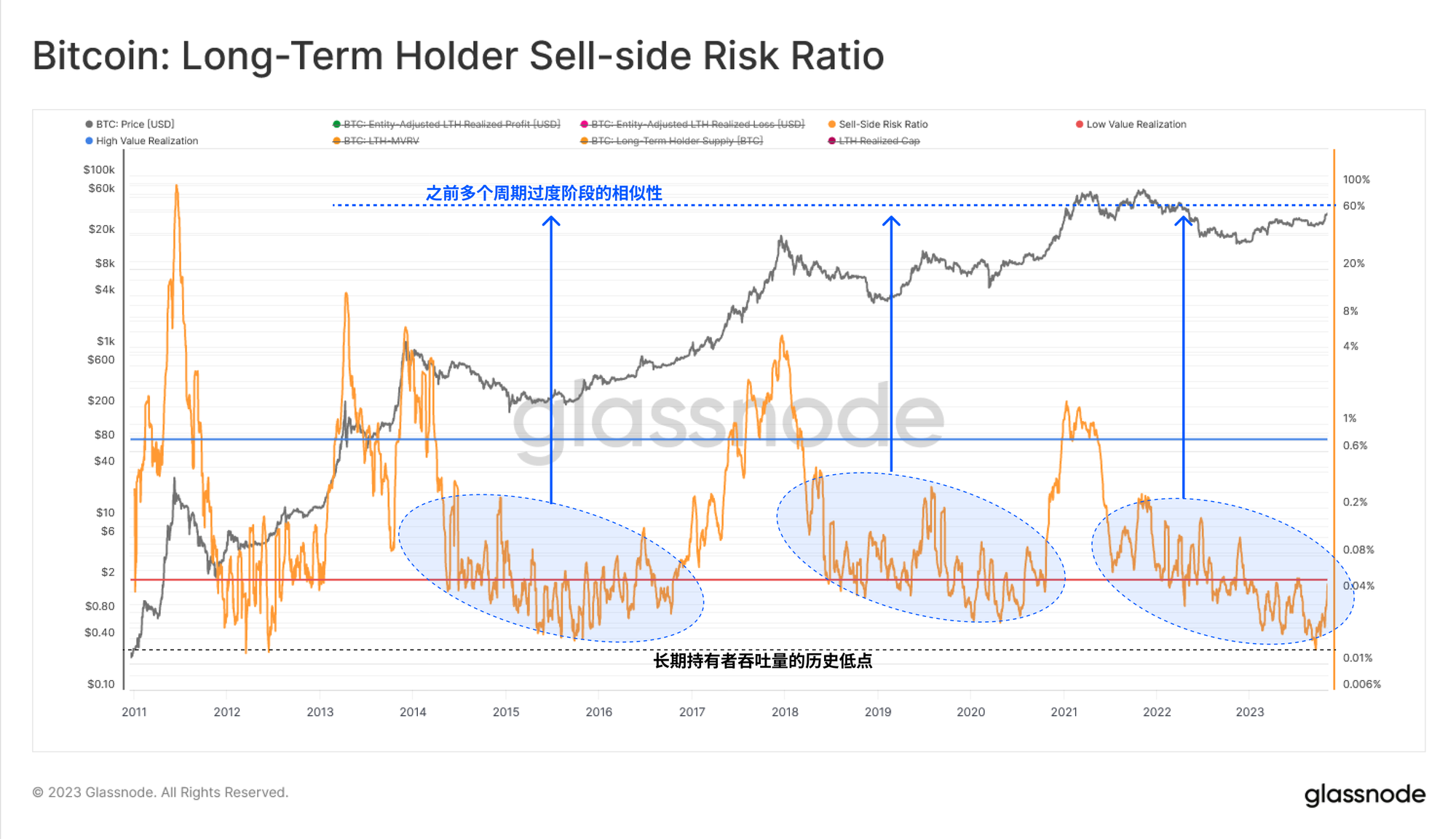 然而,对于长期持有者群体来说,他们的卖方风险比率略有上升,但从历史背景来看仍然极低。这一指标目前的结构类似于2016年和2020年后期,那也是BTC整体供应紧张的时期。