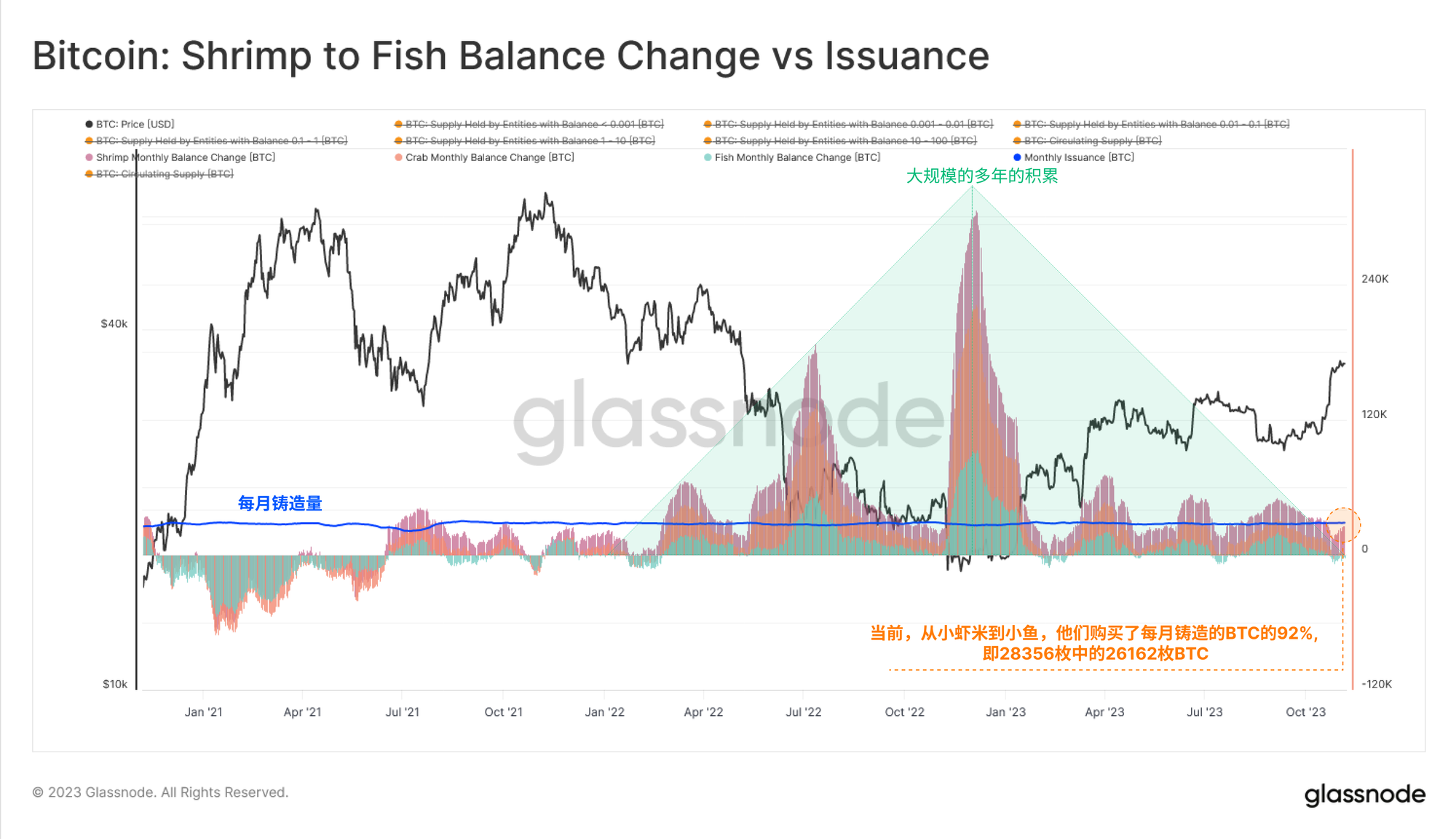 如果我们只关注小额实体,如虾 (<1 BTC)、螃蟹 (1-10 BTC) 和鱼 (10-100 BTC),我们可以看到他们的积累模式相当显著。目前,这个子群的余额增加率总和相当于新开采供应量的 92%,而且自2022年5月以来一直保持在较高水平。