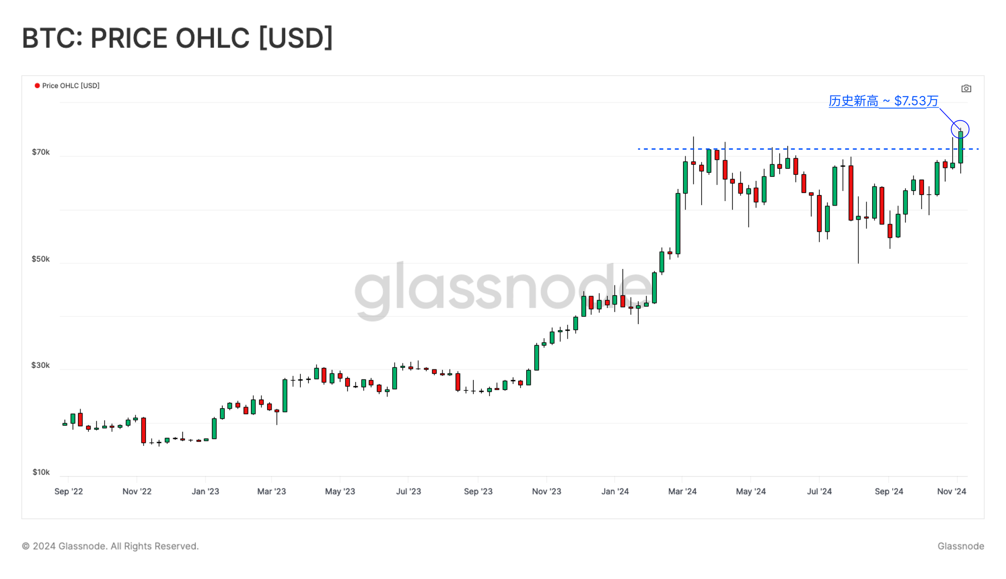 经过数月的横盘和整理,比特币因特朗普总统胜选的高可能性而冲破历史高点。价格成功突破了7.37万美元的关口,并上涨至7.53万美元以上,进入价格发现阶段,使投资者情绪更趋向于“狂热”。