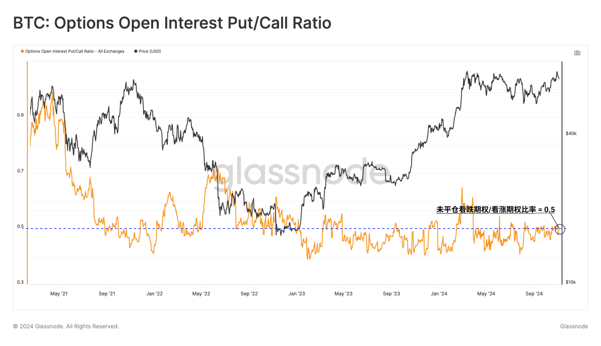 在评估分配于看跌(put)和看涨(call)合约的未平仓合约的比率时,双方几乎平分秋色。这表明投资者和投机者已对市场的双向大幅波动进行了对冲和押注。